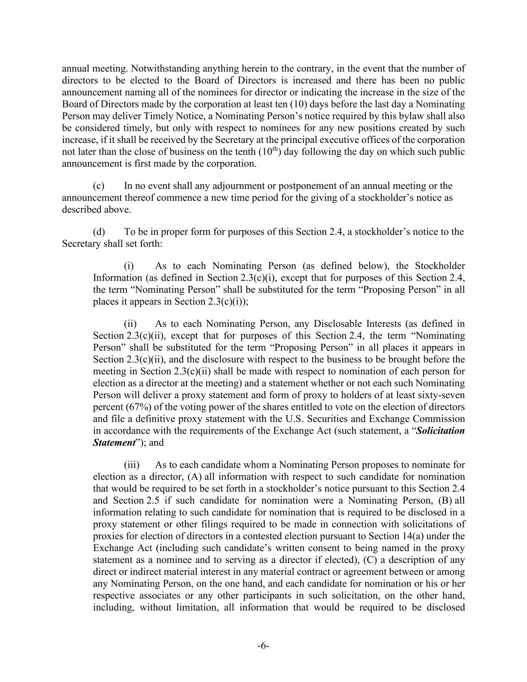 -6- annual meeting. Notwithstanding anything herein to the contrary, in the event that the number of directors to be elected to the Board of Directors is increased and there has been no public announcement naming all of the nominees for director or indicating the increase in the size of the Board of Directors made by the corporation at least ten (10) days before the last day a Nominating Person may deliver Timely Notice, a Nominating Person’s notice required by this bylaw shall also be considered timely, but only with respect to nominees for any new positions created by such increase, if it shall be received by the Secretary at the principal executive offices of the corporation not later than the close of business on the tenth (10th) day following the day on which such public announcement is first made by the corporation. (c) In no event shall any adjournment or postponement of an annual meeting or the announcement thereof commence a new time period for the giving of a stockholder’s notice as described above. (d) To be in proper form for purposes of this Section 2.4, a stockholder’s notice to the Secretary shall set forth: (i) As to each Nominating Person (as defined below), the Stockholder Information (as defined in Section 2.3(c)(i), except that for purposes of this Section 2.4, the term “Nominating Person” shall be substituted for the term “Proposing Person” in all places it appears in Section 2.3(c)(i)); (ii) As to each Nominating Person, any Disclosable Interests (as defined in Section 2.3(c)(ii), except that for purposes of this Section 2.4, the term “Nominating Person” shall be substituted for the term “Proposing Person” in all places it appears in Section 2.3(c)(ii), and the disclosure with respect to the business to be brought before the meeting in Section 2.3(c)(ii) shall be made with respect to nomination of each person for election as a director at the meeting) and a statement whether or not each such Nominating Person will deliver a proxy statement and form of proxy to holders of at least sixty-seven percent (67%) of the voting power of the shares entitled to vote on the election of directors and file a definitive proxy statement with the U.S. Securities and Exchange Commission in accordance with the requirements of the Exchange Act (such statement, a “Solicitation Statement”); and (iii) As to each candidate whom a Nominating Person proposes to nominate for election as a director, (A) all information with respect to such candidate for nomination that would be required to be set forth in a stockholder’s notice pursuant to this Section 2.4 and Section 2.5 if such candidate for nomination were a Nominating Person, (B) all information relating to such candidate for nomination that is required to be disclosed in a proxy statement or other filings required to be made in connection with solicitations of proxies for election of directors in a contested election pursuant to Section 14(a) under the Exchange Act (including such candidate’s written consent to being named in the proxy statement as a nominee and to serving as a director if elected), (C) a description of any direct or indirect material interest in any material contract or agreement between or among any Nominating Person, on the one hand, and each candidate for nomination or his or her respective associates or any other participants in such solicitation, on the other hand, including, without limitation, all information that would be required to be disclosed