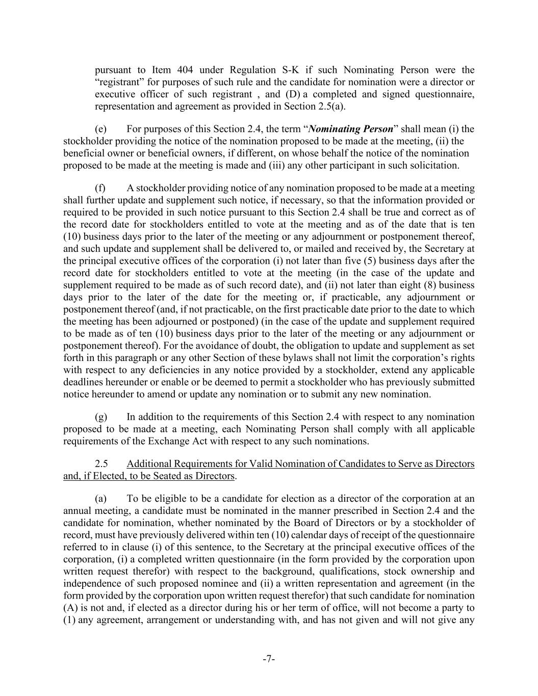 -7- pursuant to Item 404 under Regulation S-K if such Nominating Person were the “registrant” for purposes of such rule and the candidate for nomination were a director or executive officer of such registrant , and (D) a completed and signed questionnaire, representation and agreement as provided in Section 2.5(a). (e) For purposes of this Section 2.4, the term “Nominating Person” shall mean (i) the stockholder providing the notice of the nomination proposed to be made at the meeting, (ii) the beneficial owner or beneficial owners, if different, on whose behalf the notice of the nomination proposed to be made at the meeting is made and (iii) any other participant in such solicitation. (f) A stockholder providing notice of any nomination proposed to be made at a meeting shall further update and supplement such notice, if necessary, so that the information provided or required to be provided in such notice pursuant to this Section 2.4 shall be true and correct as of the record date for stockholders entitled to vote at the meeting and as of the date that is ten (10) business days prior to the later of the meeting or any adjournment or postponement thereof, and such update and supplement shall be delivered to, or mailed and received by, the Secretary at the principal executive offices of the corporation (i) not later than five (5) business days after the record date for stockholders entitled to vote at the meeting (in the case of the update and supplement required to be made as of such record date), and (ii) not later than eight (8) business days prior to the later of the date for the meeting or, if practicable, any adjournment or postponement thereof (and, if not practicable, on the first practicable date prior to the date to which the meeting has been adjourned or postponed) (in the case of the update and supplement required to be made as of ten (10) business days prior to the later of the meeting or any adjournment or postponement thereof). For the avoidance of doubt, the obligation to update and supplement as set forth in this paragraph or any other Section of these bylaws shall not limit the corporation’s rights with respect to any deficiencies in any notice provided by a stockholder, extend any applicable deadlines hereunder or enable or be deemed to permit a stockholder who has previously submitted notice hereunder to amend or update any nomination or to submit any new nomination. (g) In addition to the requirements of this Section 2.4 with respect to any nomination proposed to be made at a meeting, each Nominating Person shall comply with all applicable requirements of the Exchange Act with respect to any such nominations. 2.5 Additional Requirements for Valid Nomination of Candidates to Serve as Directors and, if Elected, to be Seated as Directors. (a) To be eligible to be a candidate for election as a director of the corporation at an annual meeting, a candidate must be nominated in the manner prescribed in Section 2.4 and the candidate for nomination, whether nominated by the Board of Directors or by a stockholder of record, must have previously delivered within ten (10) calendar days of receipt of the questionnaire referred to in clause (i) of this sentence, to the Secretary at the principal executive offices of the corporation, (i) a completed written questionnaire (in the form provided by the corporation upon written request therefor) with respect to the background, qualifications, stock ownership and independence of such proposed nominee and (ii) a written representation and agreement (in the form provided by the corporation upon written request therefor) that such candidate for nomination (A) is not and, if elected as a director during his or her term of office, will not become a party to (1) any agreement, arrangement or understanding with, and has not given and will not give any