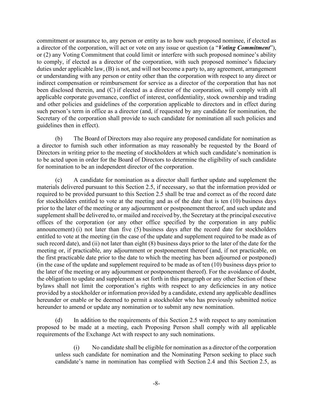 -8- commitment or assurance to, any person or entity as to how such proposed nominee, if elected as a director of the corporation, will act or vote on any issue or question (a “Voting Commitment”), or (2) any Voting Commitment that could limit or interfere with such proposed nominee’s ability to comply, if elected as a director of the corporation, with such proposed nominee’s fiduciary duties under applicable law, (B) is not, and will not become a party to, any agreement, arrangement or understanding with any person or entity other than the corporation with respect to any direct or indirect compensation or reimbursement for service as a director of the corporation that has not been disclosed therein, and (C) if elected as a director of the corporation, will comply with all applicable corporate governance, conflict of interest, confidentiality, stock ownership and trading and other policies and guidelines of the corporation applicable to directors and in effect during such person’s term in office as a director (and, if requested by any candidate for nomination, the Secretary of the corporation shall provide to such candidate for nomination all such policies and guidelines then in effect). (b) The Board of Directors may also require any proposed candidate for nomination as a director to furnish such other information as may reasonably be requested by the Board of Directors in writing prior to the meeting of stockholders at which such candidate’s nomination is to be acted upon in order for the Board of Directors to determine the eligibility of such candidate for nomination to be an independent director of the corporation. (c) A candidate for nomination as a director shall further update and supplement the materials delivered pursuant to this Section 2.5, if necessary, so that the information provided or required to be provided pursuant to this Section 2.5 shall be true and correct as of the record date for stockholders entitled to vote at the meeting and as of the date that is ten (10) business days prior to the later of the meeting or any adjournment or postponement thereof, and such update and supplement shall be delivered to, or mailed and received by, the Secretary at the principal executive offices of the corporation (or any other office specified by the corporation in any public announcement) (i) not later than five (5) business days after the record date for stockholders entitled to vote at the meeting (in the case of the update and supplement required to be made as of such record date), and (ii) not later than eight (8) business days prior to the later of the date for the meeting or, if practicable, any adjournment or postponement thereof (and, if not practicable, on the first practicable date prior to the date to which the meeting has been adjourned or postponed) (in the case of the update and supplement required to be made as of ten (10) business days prior to the later of the meeting or any adjournment or postponement thereof). For the avoidance of doubt, the obligation to update and supplement as set forth in this paragraph or any other Section of these bylaws shall not limit the corporation’s rights with respect to any deficiencies in any notice provided by a stockholder or information provided by a candidate, extend any applicable deadlines hereunder or enable or be deemed to permit a stockholder who has previously submitted notice hereunder to amend or update any nomination or to submit any new nomination. (d) In addition to the requirements of this Section 2.5 with respect to any nomination proposed to be made at a meeting, each Proposing Person shall comply with all applicable requirements of the Exchange Act with respect to any such nominations. (i) No candidate shall be eligible for nomination as a director of the corporation unless such candidate for nomination and the Nominating Person seeking to place such candidate’s name in nomination has complied with Section 2.4 and this Section 2.5, as