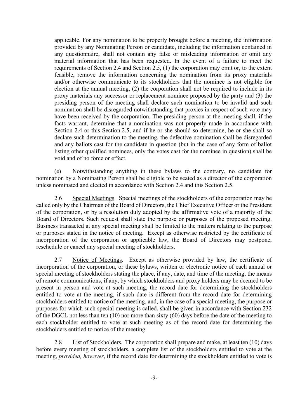 -9- applicable. For any nomination to be properly brought before a meeting, the information provided by any Nominating Person or candidate, including the information contained in any questionnaire, shall not contain any false or misleading information or omit any material information that has been requested. In the event of a failure to meet the requirements of Section 2.4 and Section 2.5, (1) the corporation may omit or, to the extent feasible, remove the information concerning the nomination from its proxy materials and/or otherwise communicate to its stockholders that the nominee is not eligible for election at the annual meeting, (2) the corporation shall not be required to include in its proxy materials any successor or replacement nominee proposed by the party and (3) the presiding person of the meeting shall declare such nomination to be invalid and such nomination shall be disregarded notwithstanding that proxies in respect of such vote may have been received by the corporation. The presiding person at the meeting shall, if the facts warrant, determine that a nomination was not properly made in accordance with Section 2.4 or this Section 2.5, and if he or she should so determine, he or she shall so declare such determination to the meeting, the defective nomination shall be disregarded and any ballots cast for the candidate in question (but in the case of any form of ballot listing other qualified nominees, only the votes cast for the nominee in question) shall be void and of no force or effect. (e) Notwithstanding anything in these bylaws to the contrary, no candidate for nomination by a Nominating Person shall be eligible to be seated as a director of the corporation unless nominated and elected in accordance with Section 2.4 and this Section 2.5. 2.6 Special Meetings. Special meetings of the stockholders of the corporation may be called only by the Chairman of the Board of Directors, the Chief Executive Officer or the President of the corporation, or by a resolution duly adopted by the affirmative vote of a majority of the Board of Directors. Such request shall state the purpose or purposes of the proposed meeting. Business transacted at any special meeting shall be limited to the matters relating to the purpose or purposes stated in the notice of meeting. Except as otherwise restricted by the certificate of incorporation of the corporation or applicable law, the Board of Directors may postpone, reschedule or cancel any special meeting of stockholders. 2.7 Notice of Meetings. Except as otherwise provided by law, the certificate of incorporation of the corporation, or these bylaws, written or electronic notice of each annual or special meeting of stockholders stating the place, if any, date, and time of the meeting, the means of remote communications, if any, by which stockholders and proxy holders may be deemed to be present in person and vote at such meeting, the record date for determining the stockholders entitled to vote at the meeting, if such date is different from the record date for determining stockholders entitled to notice of the meeting, and, in the case of a special meeting, the purpose or purposes for which such special meeting is called, shall be given in accordance with Section 232 of the DGCL not less than ten (10) nor more than sixty (60) days before the date of the meeting to each stockholder entitled to vote at such meeting as of the record date for determining the stockholders entitled to notice of the meeting. 2.8 List of Stockholders. The corporation shall prepare and make, at least ten (10) days before every meeting of stockholders, a complete list of the stockholders entitled to vote at the meeting, provided, however, if the record date for determining the stockholders entitled to vote is