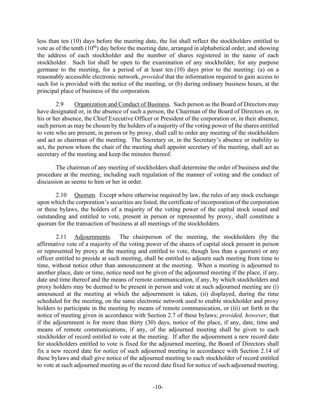 -10- less than ten (10) days before the meeting date, the list shall reflect the stockholders entitled to vote as of the tenth (10th) day before the meeting date, arranged in alphabetical order, and showing the address of each stockholder and the number of shares registered in the name of each stockholder. Such list shall be open to the examination of any stockholder, for any purpose germane to the meeting, for a period of at least ten (10) days prior to the meeting: (a) on a reasonably accessible electronic network, provided that the information required to gain access to such list is provided with the notice of the meeting, or (b) during ordinary business hours, at the principal place of business of the corporation. 2.9 Organization and Conduct of Business. Such person as the Board of Directors may have designated or, in the absence of such a person, the Chairman of the Board of Directors or, in his or her absence, the Chief Executive Officer or President of the corporation or, in their absence, such person as may be chosen by the holders of a majority of the voting power of the shares entitled to vote who are present, in person or by proxy, shall call to order any meeting of the stockholders and act as chairman of the meeting. The Secretary or, in the Secretary’s absence or inability to act, the person whom the chair of the meeting shall appoint secretary of the meeting, shall act as secretary of the meeting and keep the minutes thereof. The chairman of any meeting of stockholders shall determine the order of business and the procedure at the meeting, including such regulation of the manner of voting and the conduct of discussion as seems to him or her in order. 2.10 Quorum. Except where otherwise required by law, the rules of any stock exchange upon which the corporation’s securities are listed, the certificate of incorporation of the corporation or these bylaws, the holders of a majority of the voting power of the capital stock issued and outstanding and entitled to vote, present in person or represented by proxy, shall constitute a quorum for the transaction of business at all meetings of the stockholders. 2.11 Adjournments. The chairperson of the meeting, the stockholders (by the affirmative vote of a majority of the voting power of the shares of capital stock present in person or represented by proxy at the meeting and entitled to vote, though less than a quorum) or any officer entitled to preside at such meeting, shall be entitled to adjourn such meeting from time to time, without notice other than announcement at the meeting. When a meeting is adjourned to another place, date or time, notice need not be given of the adjourned meeting if the place, if any, date and time thereof and the means of remote communication, if any, by which stockholders and proxy holders may be deemed to be present in person and vote at such adjourned meeting are (i) announced at the meeting at which the adjournment is taken, (ii) displayed, during the time scheduled for the meeting, on the same electronic network used to enable stockholder and proxy holders to participate in the meeting by means of remote communication, or (iii) set forth in the notice of meeting given in accordance with Section 2.7 of these bylaws; provided, however, that if the adjournment is for more than thirty (30) days, notice of the place, if any, date, time and means of remote communications, if any, of the adjourned meeting shall be given to each stockholder of record entitled to vote at the meeting. If after the adjournment a new record date for stockholders entitled to vote is fixed for the adjourned meeting, the Board of Directors shall fix a new record date for notice of such adjourned meeting in accordance with Section 2.14 of these bylaws and shall give notice of the adjourned meeting to each stockholder of record entitled to vote at such adjourned meeting as of the record date fixed for notice of such adjourned meeting.