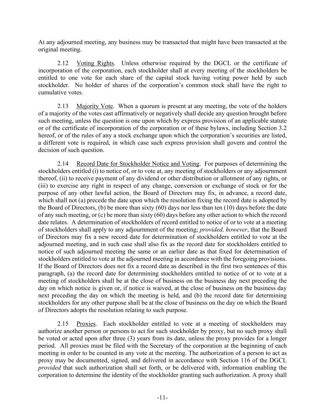 -11- At any adjourned meeting, any business may be transacted that might have been transacted at the original meeting. 2.12 Voting Rights. Unless otherwise required by the DGCL or the certificate of incorporation of the corporation, each stockholder shall at every meeting of the stockholders be entitled to one vote for each share of the capital stock having voting power held by such stockholder. No holder of shares of the corporation’s common stock shall have the right to cumulative votes. 2.13 Majority Vote. When a quorum is present at any meeting, the vote of the holders of a majority of the votes cast affirmatively or negatively shall decide any question brought before such meeting, unless the question is one upon which by express provision of an applicable statute or of the certificate of incorporation of the corporation or of these bylaws, including Section 3.2 hereof, or of the rules of any a stock exchange upon which the corporation’s securities are listed, a different vote is required, in which case such express provision shall govern and control the decision of such question. 2.14 Record Date for Stockholder Notice and Voting. For purposes of determining the stockholders entitled (i) to notice of, or to vote at, any meeting of stockholders or any adjournment thereof, (ii) to receive payment of any dividend or other distribution or allotment of any rights, or (iii) to exercise any right in respect of any change, conversion or exchange of stock or for the purpose of any other lawful action, the Board of Directors may fix, in advance, a record date, which shall not (a) precede the date upon which the resolution fixing the record date is adopted by the Board of Directors, (b) be more than sixty (60) days nor less than ten (10) days before the date of any such meeting, or (c) be more than sixty (60) days before any other action to which the record date relates. A determination of stockholders of record entitled to notice of or to vote at a meeting of stockholders shall apply to any adjournment of the meeting; provided, however, that the Board of Directors may fix a new record date for determination of stockholders entitled to vote at the adjourned meeting, and in such case shall also fix as the record date for stockholders entitled to notice of such adjourned meeting the same or an earlier date as that fixed for determination of stockholders entitled to vote at the adjourned meeting in accordance with the foregoing provisions. If the Board of Directors does not fix a record date as described in the first two sentences of this paragraph, (a) the record date for determining stockholders entitled to notice of or to vote at a meeting of stockholders shall be at the close of business on the business day next preceding the day on which notice is given or, if notice is waived, at the close of business on the business day next preceding the day on which the meeting is held, and (b) the record date for determining stockholders for any other purpose shall be at the close of business on the day on which the Board of Directors adopts the resolution relating to such purpose. 2.15 Proxies. Each stockholder entitled to vote at a meeting of stockholders may authorize another person or persons to act for such stockholder by proxy, but no such proxy shall be voted or acted upon after three (3) years from its date, unless the proxy provides for a longer period. All proxies must be filed with the Secretary of the corporation at the beginning of each meeting in order to be counted in any vote at the meeting. The authorization of a person to act as proxy may be documented, signed, and delivered in accordance with Section 116 of the DGCL provided that such authorization shall set forth, or be delivered with, information enabling the corporation to determine the identity of the stockholder granting such authorization. A proxy shall