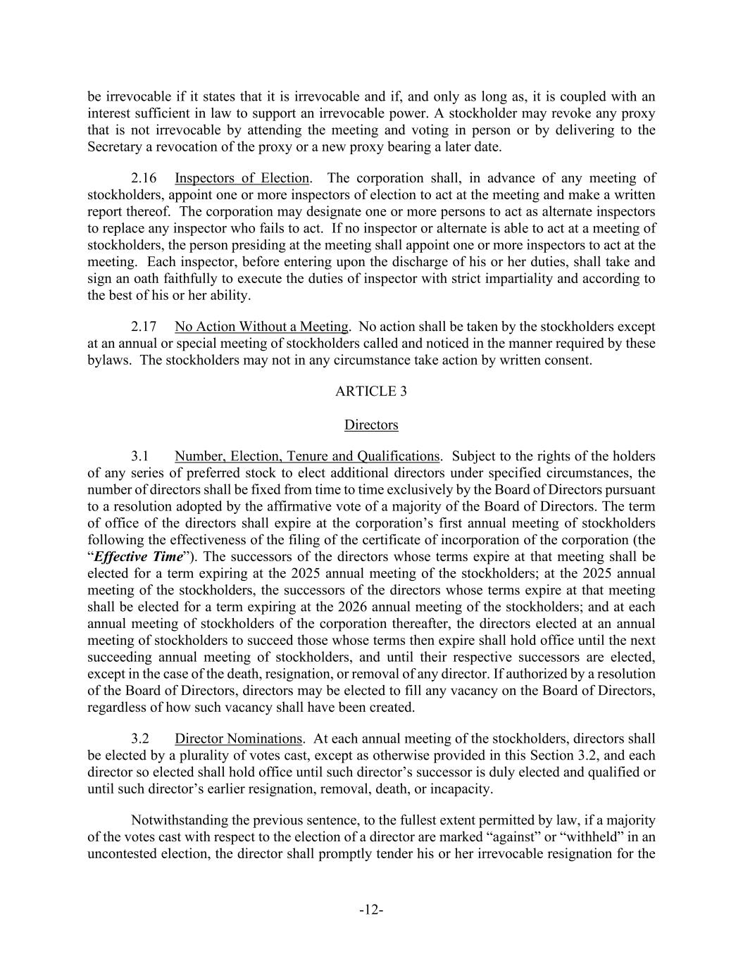 -12- be irrevocable if it states that it is irrevocable and if, and only as long as, it is coupled with an interest sufficient in law to support an irrevocable power. A stockholder may revoke any proxy that is not irrevocable by attending the meeting and voting in person or by delivering to the Secretary a revocation of the proxy or a new proxy bearing a later date. 2.16 Inspectors of Election. The corporation shall, in advance of any meeting of stockholders, appoint one or more inspectors of election to act at the meeting and make a written report thereof. The corporation may designate one or more persons to act as alternate inspectors to replace any inspector who fails to act. If no inspector or alternate is able to act at a meeting of stockholders, the person presiding at the meeting shall appoint one or more inspectors to act at the meeting. Each inspector, before entering upon the discharge of his or her duties, shall take and sign an oath faithfully to execute the duties of inspector with strict impartiality and according to the best of his or her ability. 2.17 No Action Without a Meeting. No action shall be taken by the stockholders except at an annual or special meeting of stockholders called and noticed in the manner required by these bylaws. The stockholders may not in any circumstance take action by written consent. ARTICLE 3 Directors 3.1 Number, Election, Tenure and Qualifications. Subject to the rights of the holders of any series of preferred stock to elect additional directors under specified circumstances, the number of directors shall be fixed from time to time exclusively by the Board of Directors pursuant to a resolution adopted by the affirmative vote of a majority of the Board of Directors. The term of office of the directors shall expire at the corporation’s first annual meeting of stockholders following the effectiveness of the filing of the certificate of incorporation of the corporation (the “Effective Time”). The successors of the directors whose terms expire at that meeting shall be elected for a term expiring at the 2025 annual meeting of the stockholders; at the 2025 annual meeting of the stockholders, the successors of the directors whose terms expire at that meeting shall be elected for a term expiring at the 2026 annual meeting of the stockholders; and at each annual meeting of stockholders of the corporation thereafter, the directors elected at an annual meeting of stockholders to succeed those whose terms then expire shall hold office until the next succeeding annual meeting of stockholders, and until their respective successors are elected, except in the case of the death, resignation, or removal of any director. If authorized by a resolution of the Board of Directors, directors may be elected to fill any vacancy on the Board of Directors, regardless of how such vacancy shall have been created. 3.2 Director Nominations. At each annual meeting of the stockholders, directors shall be elected by a plurality of votes cast, except as otherwise provided in this Section 3.2, and each director so elected shall hold office until such director’s successor is duly elected and qualified or until such director’s earlier resignation, removal, death, or incapacity. Notwithstanding the previous sentence, to the fullest extent permitted by law, if a majority of the votes cast with respect to the election of a director are marked “against” or “withheld” in an uncontested election, the director shall promptly tender his or her irrevocable resignation for the