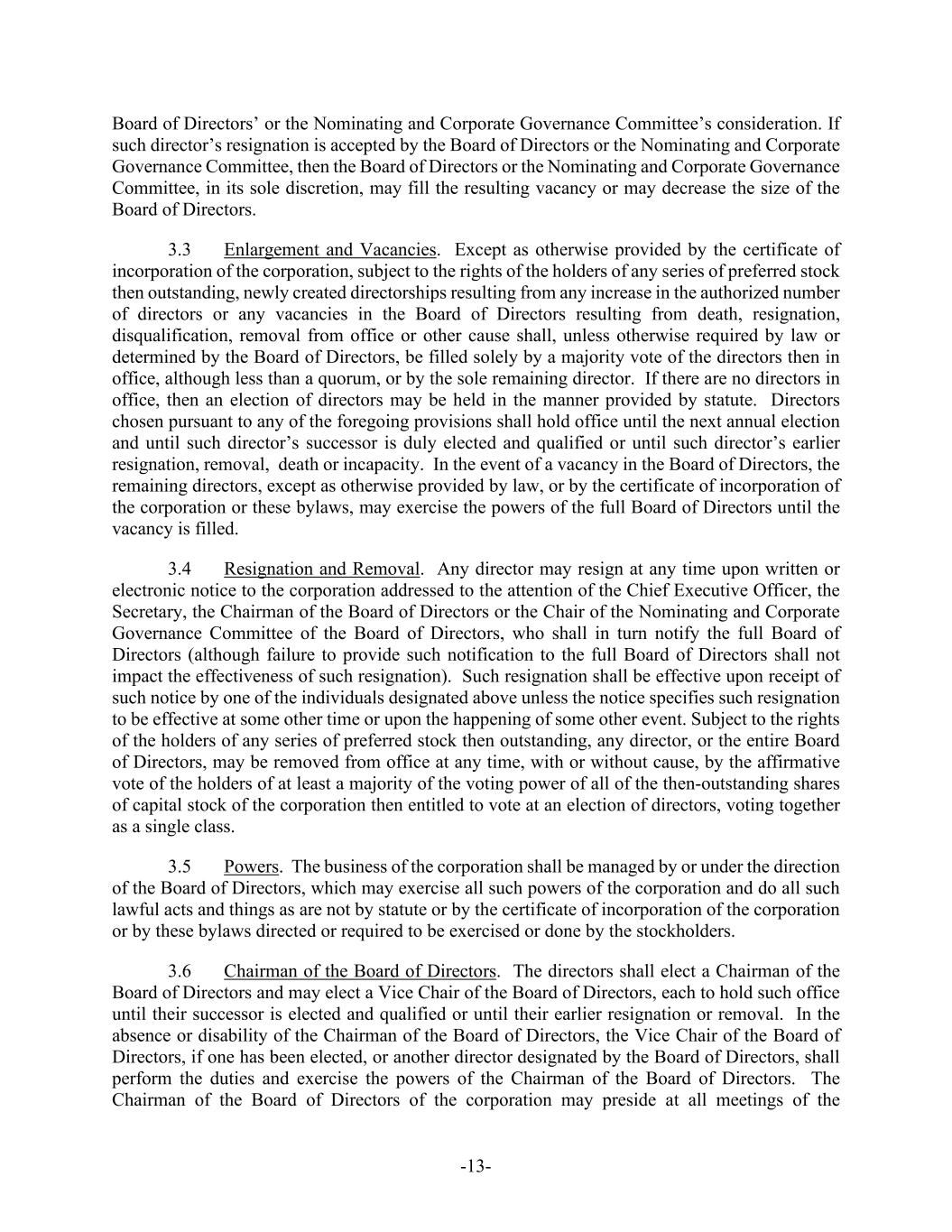 -13- Board of Directors’ or the Nominating and Corporate Governance Committee’s consideration. If such director’s resignation is accepted by the Board of Directors or the Nominating and Corporate Governance Committee, then the Board of Directors or the Nominating and Corporate Governance Committee, in its sole discretion, may fill the resulting vacancy or may decrease the size of the Board of Directors. 3.3 Enlargement and Vacancies. Except as otherwise provided by the certificate of incorporation of the corporation, subject to the rights of the holders of any series of preferred stock then outstanding, newly created directorships resulting from any increase in the authorized number of directors or any vacancies in the Board of Directors resulting from death, resignation, disqualification, removal from office or other cause shall, unless otherwise required by law or determined by the Board of Directors, be filled solely by a majority vote of the directors then in office, although less than a quorum, or by the sole remaining director. If there are no directors in office, then an election of directors may be held in the manner provided by statute. Directors chosen pursuant to any of the foregoing provisions shall hold office until the next annual election and until such director’s successor is duly elected and qualified or until such director’s earlier resignation, removal, death or incapacity. In the event of a vacancy in the Board of Directors, the remaining directors, except as otherwise provided by law, or by the certificate of incorporation of the corporation or these bylaws, may exercise the powers of the full Board of Directors until the vacancy is filled. 3.4 Resignation and Removal. Any director may resign at any time upon written or electronic notice to the corporation addressed to the attention of the Chief Executive Officer, the Secretary, the Chairman of the Board of Directors or the Chair of the Nominating and Corporate Governance Committee of the Board of Directors, who shall in turn notify the full Board of Directors (although failure to provide such notification to the full Board of Directors shall not impact the effectiveness of such resignation). Such resignation shall be effective upon receipt of such notice by one of the individuals designated above unless the notice specifies such resignation to be effective at some other time or upon the happening of some other event. Subject to the rights of the holders of any series of preferred stock then outstanding, any director, or the entire Board of Directors, may be removed from office at any time, with or without cause, by the affirmative vote of the holders of at least a majority of the voting power of all of the then-outstanding shares of capital stock of the corporation then entitled to vote at an election of directors, voting together as a single class. 3.5 Powers. The business of the corporation shall be managed by or under the direction of the Board of Directors, which may exercise all such powers of the corporation and do all such lawful acts and things as are not by statute or by the certificate of incorporation of the corporation or by these bylaws directed or required to be exercised or done by the stockholders. 3.6 Chairman of the Board of Directors. The directors shall elect a Chairman of the Board of Directors and may elect a Vice Chair of the Board of Directors, each to hold such office until their successor is elected and qualified or until their earlier resignation or removal. In the absence or disability of the Chairman of the Board of Directors, the Vice Chair of the Board of Directors, if one has been elected, or another director designated by the Board of Directors, shall perform the duties and exercise the powers of the Chairman of the Board of Directors. The Chairman of the Board of Directors of the corporation may preside at all meetings of the