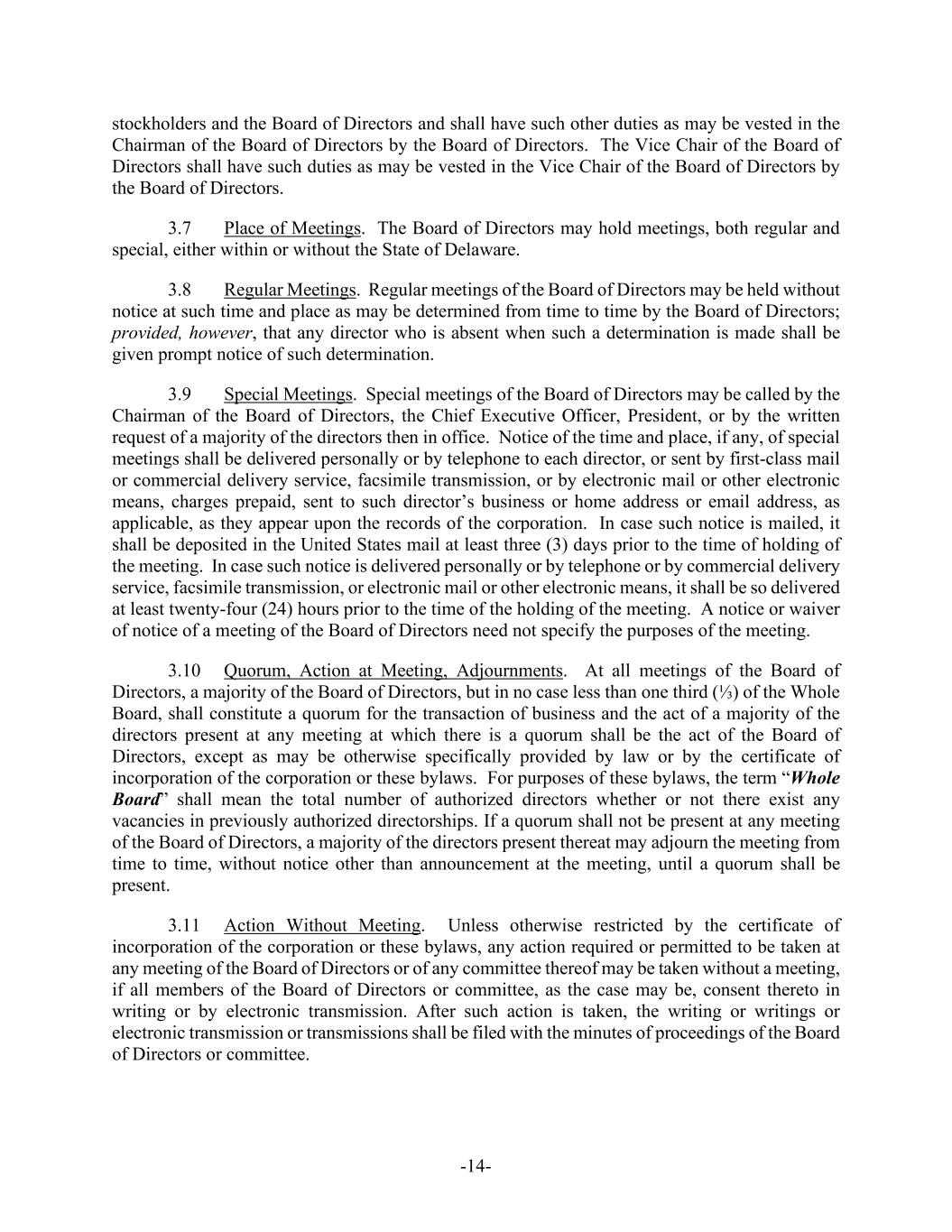 -14- stockholders and the Board of Directors and shall have such other duties as may be vested in the Chairman of the Board of Directors by the Board of Directors. The Vice Chair of the Board of Directors shall have such duties as may be vested in the Vice Chair of the Board of Directors by the Board of Directors. 3.7 Place of Meetings. The Board of Directors may hold meetings, both regular and special, either within or without the State of Delaware. 3.8 Regular Meetings. Regular meetings of the Board of Directors may be held without notice at such time and place as may be determined from time to time by the Board of Directors; provided, however, that any director who is absent when such a determination is made shall be given prompt notice of such determination. 3.9 Special Meetings. Special meetings of the Board of Directors may be called by the Chairman of the Board of Directors, the Chief Executive Officer, President, or by the written request of a majority of the directors then in office. Notice of the time and place, if any, of special meetings shall be delivered personally or by telephone to each director, or sent by first-class mail or commercial delivery service, facsimile transmission, or by electronic mail or other electronic means, charges prepaid, sent to such director’s business or home address or email address, as applicable, as they appear upon the records of the corporation. In case such notice is mailed, it shall be deposited in the United States mail at least three (3) days prior to the time of holding of the meeting. In case such notice is delivered personally or by telephone or by commercial delivery service, facsimile transmission, or electronic mail or other electronic means, it shall be so delivered at least twenty-four (24) hours prior to the time of the holding of the meeting. A notice or waiver of notice of a meeting of the Board of Directors need not specify the purposes of the meeting. 3.10 Quorum, Action at Meeting, Adjournments. At all meetings of the Board of Directors, a majority of the Board of Directors, but in no case less than one third (⅓) of the Whole Board, shall constitute a quorum for the transaction of business and the act of a majority of the directors present at any meeting at which there is a quorum shall be the act of the Board of Directors, except as may be otherwise specifically provided by law or by the certificate of incorporation of the corporation or these bylaws. For purposes of these bylaws, the term “Whole Board” shall mean the total number of authorized directors whether or not there exist any vacancies in previously authorized directorships. If a quorum shall not be present at any meeting of the Board of Directors, a majority of the directors present thereat may adjourn the meeting from time to time, without notice other than announcement at the meeting, until a quorum shall be present. 3.11 Action Without Meeting. Unless otherwise restricted by the certificate of incorporation of the corporation or these bylaws, any action required or permitted to be taken at any meeting of the Board of Directors or of any committee thereof may be taken without a meeting, if all members of the Board of Directors or committee, as the case may be, consent thereto in writing or by electronic transmission. After such action is taken, the writing or writings or electronic transmission or transmissions shall be filed with the minutes of proceedings of the Board of Directors or committee.