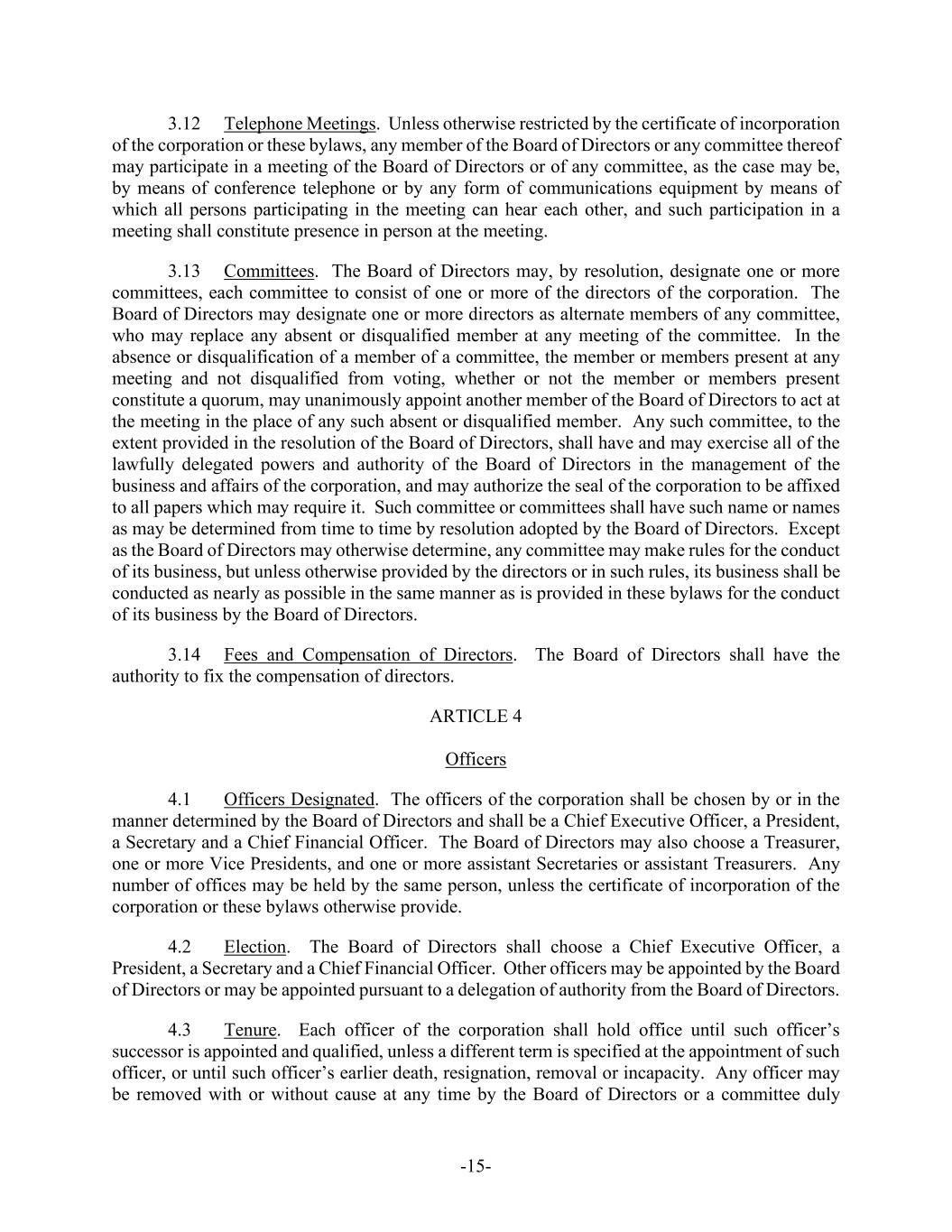 -15- 3.12 Telephone Meetings. Unless otherwise restricted by the certificate of incorporation of the corporation or these bylaws, any member of the Board of Directors or any committee thereof may participate in a meeting of the Board of Directors or of any committee, as the case may be, by means of conference telephone or by any form of communications equipment by means of which all persons participating in the meeting can hear each other, and such participation in a meeting shall constitute presence in person at the meeting. 3.13 Committees. The Board of Directors may, by resolution, designate one or more committees, each committee to consist of one or more of the directors of the corporation. The Board of Directors may designate one or more directors as alternate members of any committee, who may replace any absent or disqualified member at any meeting of the committee. In the absence or disqualification of a member of a committee, the member or members present at any meeting and not disqualified from voting, whether or not the member or members present constitute a quorum, may unanimously appoint another member of the Board of Directors to act at the meeting in the place of any such absent or disqualified member. Any such committee, to the extent provided in the resolution of the Board of Directors, shall have and may exercise all of the lawfully delegated powers and authority of the Board of Directors in the management of the business and affairs of the corporation, and may authorize the seal of the corporation to be affixed to all papers which may require it. Such committee or committees shall have such name or names as may be determined from time to time by resolution adopted by the Board of Directors. Except as the Board of Directors may otherwise determine, any committee may make rules for the conduct of its business, but unless otherwise provided by the directors or in such rules, its business shall be conducted as nearly as possible in the same manner as is provided in these bylaws for the conduct of its business by the Board of Directors. 3.14 Fees and Compensation of Directors. The Board of Directors shall have the authority to fix the compensation of directors. ARTICLE 4 Officers 4.1 Officers Designated. The officers of the corporation shall be chosen by or in the manner determined by the Board of Directors and shall be a Chief Executive Officer, a President, a Secretary and a Chief Financial Officer. The Board of Directors may also choose a Treasurer, one or more Vice Presidents, and one or more assistant Secretaries or assistant Treasurers. Any number of offices may be held by the same person, unless the certificate of incorporation of the corporation or these bylaws otherwise provide. 4.2 Election. The Board of Directors shall choose a Chief Executive Officer, a President, a Secretary and a Chief Financial Officer. Other officers may be appointed by the Board of Directors or may be appointed pursuant to a delegation of authority from the Board of Directors. 4.3 Tenure. Each officer of the corporation shall hold office until such officer’s successor is appointed and qualified, unless a different term is specified at the appointment of such officer, or until such officer’s earlier death, resignation, removal or incapacity. Any officer may be removed with or without cause at any time by the Board of Directors or a committee duly