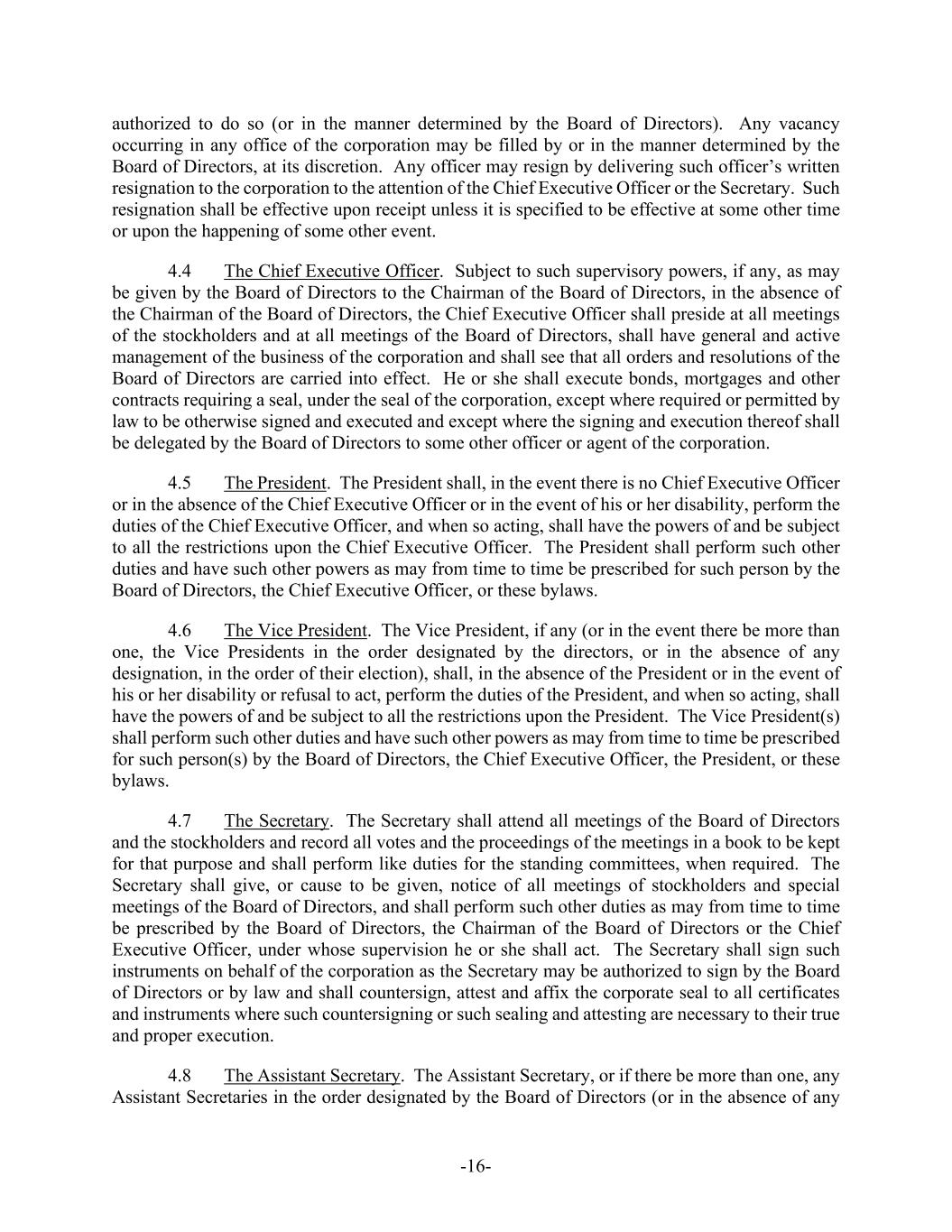-16- authorized to do so (or in the manner determined by the Board of Directors). Any vacancy occurring in any office of the corporation may be filled by or in the manner determined by the Board of Directors, at its discretion. Any officer may resign by delivering such officer’s written resignation to the corporation to the attention of the Chief Executive Officer or the Secretary. Such resignation shall be effective upon receipt unless it is specified to be effective at some other time or upon the happening of some other event. 4.4 The Chief Executive Officer. Subject to such supervisory powers, if any, as may be given by the Board of Directors to the Chairman of the Board of Directors, in the absence of the Chairman of the Board of Directors, the Chief Executive Officer shall preside at all meetings of the stockholders and at all meetings of the Board of Directors, shall have general and active management of the business of the corporation and shall see that all orders and resolutions of the Board of Directors are carried into effect. He or she shall execute bonds, mortgages and other contracts requiring a seal, under the seal of the corporation, except where required or permitted by law to be otherwise signed and executed and except where the signing and execution thereof shall be delegated by the Board of Directors to some other officer or agent of the corporation. 4.5 The President. The President shall, in the event there is no Chief Executive Officer or in the absence of the Chief Executive Officer or in the event of his or her disability, perform the duties of the Chief Executive Officer, and when so acting, shall have the powers of and be subject to all the restrictions upon the Chief Executive Officer. The President shall perform such other duties and have such other powers as may from time to time be prescribed for such person by the Board of Directors, the Chief Executive Officer, or these bylaws. 4.6 The Vice President. The Vice President, if any (or in the event there be more than one, the Vice Presidents in the order designated by the directors, or in the absence of any designation, in the order of their election), shall, in the absence of the President or in the event of his or her disability or refusal to act, perform the duties of the President, and when so acting, shall have the powers of and be subject to all the restrictions upon the President. The Vice President(s) shall perform such other duties and have such other powers as may from time to time be prescribed for such person(s) by the Board of Directors, the Chief Executive Officer, the President, or these bylaws. 4.7 The Secretary. The Secretary shall attend all meetings of the Board of Directors and the stockholders and record all votes and the proceedings of the meetings in a book to be kept for that purpose and shall perform like duties for the standing committees, when required. The Secretary shall give, or cause to be given, notice of all meetings of stockholders and special meetings of the Board of Directors, and shall perform such other duties as may from time to time be prescribed by the Board of Directors, the Chairman of the Board of Directors or the Chief Executive Officer, under whose supervision he or she shall act. The Secretary shall sign such instruments on behalf of the corporation as the Secretary may be authorized to sign by the Board of Directors or by law and shall countersign, attest and affix the corporate seal to all certificates and instruments where such countersigning or such sealing and attesting are necessary to their true and proper execution. 4.8 The Assistant Secretary. The Assistant Secretary, or if there be more than one, any Assistant Secretaries in the order designated by the Board of Directors (or in the absence of any