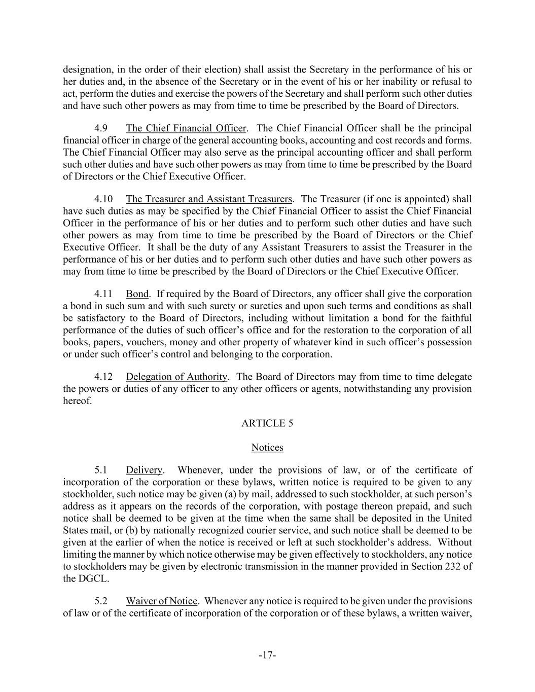 -17- designation, in the order of their election) shall assist the Secretary in the performance of his or her duties and, in the absence of the Secretary or in the event of his or her inability or refusal to act, perform the duties and exercise the powers of the Secretary and shall perform such other duties and have such other powers as may from time to time be prescribed by the Board of Directors. 4.9 The Chief Financial Officer. The Chief Financial Officer shall be the principal financial officer in charge of the general accounting books, accounting and cost records and forms. The Chief Financial Officer may also serve as the principal accounting officer and shall perform such other duties and have such other powers as may from time to time be prescribed by the Board of Directors or the Chief Executive Officer. 4.10 The Treasurer and Assistant Treasurers. The Treasurer (if one is appointed) shall have such duties as may be specified by the Chief Financial Officer to assist the Chief Financial Officer in the performance of his or her duties and to perform such other duties and have such other powers as may from time to time be prescribed by the Board of Directors or the Chief Executive Officer. It shall be the duty of any Assistant Treasurers to assist the Treasurer in the performance of his or her duties and to perform such other duties and have such other powers as may from time to time be prescribed by the Board of Directors or the Chief Executive Officer. 4.11 Bond. If required by the Board of Directors, any officer shall give the corporation a bond in such sum and with such surety or sureties and upon such terms and conditions as shall be satisfactory to the Board of Directors, including without limitation a bond for the faithful performance of the duties of such officer’s office and for the restoration to the corporation of all books, papers, vouchers, money and other property of whatever kind in such officer’s possession or under such officer’s control and belonging to the corporation. 4.12 Delegation of Authority. The Board of Directors may from time to time delegate the powers or duties of any officer to any other officers or agents, notwithstanding any provision hereof. ARTICLE 5 Notices 5.1 Delivery. Whenever, under the provisions of law, or of the certificate of incorporation of the corporation or these bylaws, written notice is required to be given to any stockholder, such notice may be given (a) by mail, addressed to such stockholder, at such person’s address as it appears on the records of the corporation, with postage thereon prepaid, and such notice shall be deemed to be given at the time when the same shall be deposited in the United States mail, or (b) by nationally recognized courier service, and such notice shall be deemed to be given at the earlier of when the notice is received or left at such stockholder’s address. Without limiting the manner by which notice otherwise may be given effectively to stockholders, any notice to stockholders may be given by electronic transmission in the manner provided in Section 232 of the DGCL. 5.2 Waiver of Notice. Whenever any notice is required to be given under the provisions of law or of the certificate of incorporation of the corporation or of these bylaws, a written waiver,
