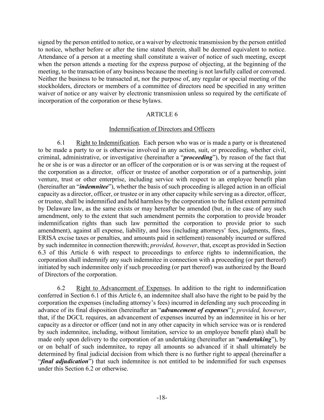 -18- signed by the person entitled to notice, or a waiver by electronic transmission by the person entitled to notice, whether before or after the time stated therein, shall be deemed equivalent to notice. Attendance of a person at a meeting shall constitute a waiver of notice of such meeting, except when the person attends a meeting for the express purpose of objecting, at the beginning of the meeting, to the transaction of any business because the meeting is not lawfully called or convened. Neither the business to be transacted at, nor the purpose of, any regular or special meeting of the stockholders, directors or members of a committee of directors need be specified in any written waiver of notice or any waiver by electronic transmission unless so required by the certificate of incorporation of the corporation or these bylaws. ARTICLE 6 Indemnification of Directors and Officers 6.1 Right to Indemnification. Each person who was or is made a party or is threatened to be made a party to or is otherwise involved in any action, suit, or proceeding, whether civil, criminal, administrative, or investigative (hereinafter a “proceeding”), by reason of the fact that he or she is or was a director or an officer of the corporation or is or was serving at the request of the corporation as a director, officer or trustee of another corporation or of a partnership, joint venture, trust or other enterprise, including service with respect to an employee benefit plan (hereinafter an “indemnitee”), whether the basis of such proceeding is alleged action in an official capacity as a director, officer, or trustee or in any other capacity while serving as a director, officer, or trustee, shall be indemnified and held harmless by the corporation to the fullest extent permitted by Delaware law, as the same exists or may hereafter be amended (but, in the case of any such amendment, only to the extent that such amendment permits the corporation to provide broader indemnification rights than such law permitted the corporation to provide prior to such amendment), against all expense, liability, and loss (including attorneys’ fees, judgments, fines, ERISA excise taxes or penalties, and amounts paid in settlement) reasonably incurred or suffered by such indemnitee in connection therewith; provided, however, that, except as provided in Section 6.3 of this Article 6 with respect to proceedings to enforce rights to indemnification, the corporation shall indemnify any such indemnitee in connection with a proceeding (or part thereof) initiated by such indemnitee only if such proceeding (or part thereof) was authorized by the Board of Directors of the corporation. 6.2 Right to Advancement of Expenses. In addition to the right to indemnification conferred in Section 6.1 of this Article 6, an indemnitee shall also have the right to be paid by the corporation the expenses (including attorney’s fees) incurred in defending any such proceeding in advance of its final disposition (hereinafter an “advancement of expenses”); provided, however, that, if the DGCL requires, an advancement of expenses incurred by an indemnitee in his or her capacity as a director or officer (and not in any other capacity in which service was or is rendered by such indemnitee, including, without limitation, service to an employee benefit plan) shall be made only upon delivery to the corporation of an undertaking (hereinafter an “undertaking”), by or on behalf of such indemnitee, to repay all amounts so advanced if it shall ultimately be determined by final judicial decision from which there is no further right to appeal (hereinafter a “final adjudication”) that such indemnitee is not entitled to be indemnified for such expenses under this Section 6.2 or otherwise.