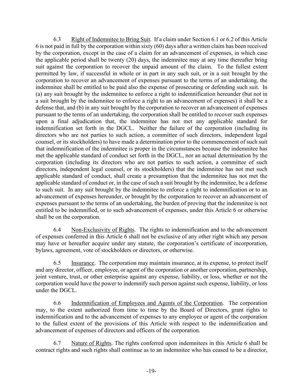 -19- 6.3 Right of Indemnitee to Bring Suit. If a claim under Section 6.1 or 6.2 of this Article 6 is not paid in full by the corporation within sixty (60) days after a written claim has been received by the corporation, except in the case of a claim for an advancement of expenses, in which case the applicable period shall be twenty (20) days, the indemnitee may at any time thereafter bring suit against the corporation to recover the unpaid amount of the claim. To the fullest extent permitted by law, if successful in whole or in part in any such suit, or in a suit brought by the corporation to recover an advancement of expenses pursuant to the terms of an undertaking, the indemnitee shall be entitled to be paid also the expense of prosecuting or defending such suit. In (a) any suit brought by the indemnitee to enforce a right to indemnification hereunder (but not in a suit brought by the indemnitee to enforce a right to an advancement of expenses) it shall be a defense that, and (b) in any suit brought by the corporation to recover an advancement of expenses pursuant to the terms of an undertaking, the corporation shall be entitled to recover such expenses upon a final adjudication that, the indemnitee has not met any applicable standard for indemnification set forth in the DGCL. Neither the failure of the corporation (including its directors who are not parties to such action, a committee of such directors, independent legal counsel, or its stockholders) to have made a determination prior to the commencement of such suit that indemnification of the indemnitee is proper in the circumstances because the indemnitee has met the applicable standard of conduct set forth in the DGCL, nor an actual determination by the corporation (including its directors who are not parties to such action, a committee of such directors, independent legal counsel, or its stockholders) that the indemnitee has not met such applicable standard of conduct, shall create a presumption that the indemnitee has not met the applicable standard of conduct or, in the case of such a suit brought by the indemnitee, be a defense to such suit. In any suit brought by the indemnitee to enforce a right to indemnification or to an advancement of expenses hereunder, or brought by the corporation to recover an advancement of expenses pursuant to the terms of an undertaking, the burden of proving that the indemnitee is not entitled to be indemnified, or to such advancement of expenses, under this Article 6 or otherwise shall be on the corporation. 6.4 Non-Exclusivity of Rights. The rights to indemnification and to the advancement of expenses conferred in this Article 6 shall not be exclusive of any other right which any person may have or hereafter acquire under any statute, the corporation’s certificate of incorporation, bylaws, agreement, vote of stockholders or directors, or otherwise. 6.5 Insurance. The corporation may maintain insurance, at its expense, to protect itself and any director, officer, employee, or agent of the corporation or another corporation, partnership, joint venture, trust, or other enterprise against any expense, liability, or loss, whether or not the corporation would have the power to indemnify such person against such expense, liability, or loss under the DGCL. 6.6 Indemnification of Employees and Agents of the Corporation. The corporation may, to the extent authorized from time to time by the Board of Directors, grant rights to indemnification and to the advancement of expenses to any employee or agent of the corporation to the fullest extent of the provisions of this Article with respect to the indemnification and advancement of expenses of directors and officers of the corporation. 6.7 Nature of Rights. The rights conferred upon indemnitees in this Article 6 shall be contract rights and such rights shall continue as to an indemnitee who has ceased to be a director,