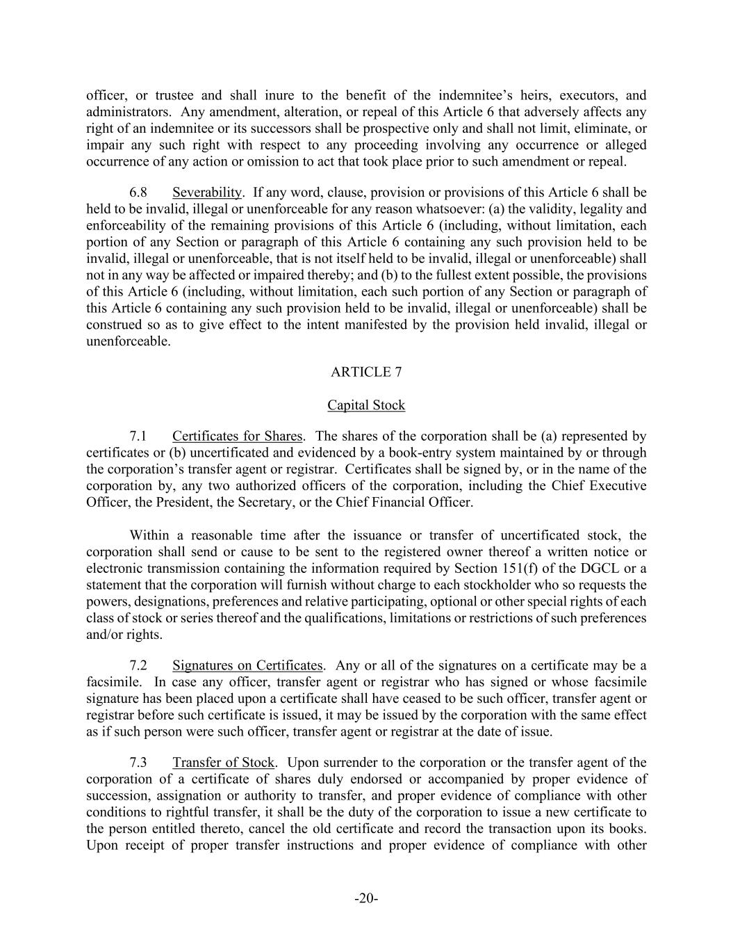 -20- officer, or trustee and shall inure to the benefit of the indemnitee’s heirs, executors, and administrators. Any amendment, alteration, or repeal of this Article 6 that adversely affects any right of an indemnitee or its successors shall be prospective only and shall not limit, eliminate, or impair any such right with respect to any proceeding involving any occurrence or alleged occurrence of any action or omission to act that took place prior to such amendment or repeal. 6.8 Severability. If any word, clause, provision or provisions of this Article 6 shall be held to be invalid, illegal or unenforceable for any reason whatsoever: (a) the validity, legality and enforceability of the remaining provisions of this Article 6 (including, without limitation, each portion of any Section or paragraph of this Article 6 containing any such provision held to be invalid, illegal or unenforceable, that is not itself held to be invalid, illegal or unenforceable) shall not in any way be affected or impaired thereby; and (b) to the fullest extent possible, the provisions of this Article 6 (including, without limitation, each such portion of any Section or paragraph of this Article 6 containing any such provision held to be invalid, illegal or unenforceable) shall be construed so as to give effect to the intent manifested by the provision held invalid, illegal or unenforceable. ARTICLE 7 Capital Stock 7.1 Certificates for Shares. The shares of the corporation shall be (a) represented by certificates or (b) uncertificated and evidenced by a book-entry system maintained by or through the corporation’s transfer agent or registrar. Certificates shall be signed by, or in the name of the corporation by, any two authorized officers of the corporation, including the Chief Executive Officer, the President, the Secretary, or the Chief Financial Officer. Within a reasonable time after the issuance or transfer of uncertificated stock, the corporation shall send or cause to be sent to the registered owner thereof a written notice or electronic transmission containing the information required by Section 151(f) of the DGCL or a statement that the corporation will furnish without charge to each stockholder who so requests the powers, designations, preferences and relative participating, optional or other special rights of each class of stock or series thereof and the qualifications, limitations or restrictions of such preferences and/or rights. 7.2 Signatures on Certificates. Any or all of the signatures on a certificate may be a facsimile. In case any officer, transfer agent or registrar who has signed or whose facsimile signature has been placed upon a certificate shall have ceased to be such officer, transfer agent or registrar before such certificate is issued, it may be issued by the corporation with the same effect as if such person were such officer, transfer agent or registrar at the date of issue. 7.3 Transfer of Stock. Upon surrender to the corporation or the transfer agent of the corporation of a certificate of shares duly endorsed or accompanied by proper evidence of succession, assignation or authority to transfer, and proper evidence of compliance with other conditions to rightful transfer, it shall be the duty of the corporation to issue a new certificate to the person entitled thereto, cancel the old certificate and record the transaction upon its books. Upon receipt of proper transfer instructions and proper evidence of compliance with other