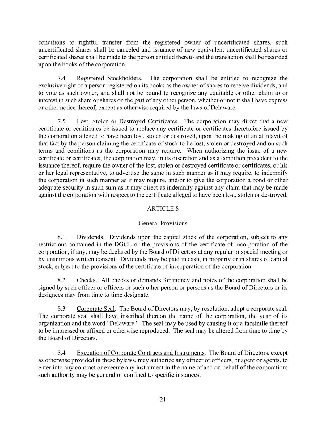 -21- conditions to rightful transfer from the registered owner of uncertificated shares, such uncertificated shares shall be canceled and issuance of new equivalent uncertificated shares or certificated shares shall be made to the person entitled thereto and the transaction shall be recorded upon the books of the corporation. 7.4 Registered Stockholders. The corporation shall be entitled to recognize the exclusive right of a person registered on its books as the owner of shares to receive dividends, and to vote as such owner, and shall not be bound to recognize any equitable or other claim to or interest in such share or shares on the part of any other person, whether or not it shall have express or other notice thereof, except as otherwise required by the laws of Delaware. 7.5 Lost, Stolen or Destroyed Certificates. The corporation may direct that a new certificate or certificates be issued to replace any certificate or certificates theretofore issued by the corporation alleged to have been lost, stolen or destroyed, upon the making of an affidavit of that fact by the person claiming the certificate of stock to be lost, stolen or destroyed and on such terms and conditions as the corporation may require. When authorizing the issue of a new certificate or certificates, the corporation may, in its discretion and as a condition precedent to the issuance thereof, require the owner of the lost, stolen or destroyed certificate or certificates, or his or her legal representative, to advertise the same in such manner as it may require, to indemnify the corporation in such manner as it may require, and/or to give the corporation a bond or other adequate security in such sum as it may direct as indemnity against any claim that may be made against the corporation with respect to the certificate alleged to have been lost, stolen or destroyed. ARTICLE 8 General Provisions 8.1 Dividends. Dividends upon the capital stock of the corporation, subject to any restrictions contained in the DGCL or the provisions of the certificate of incorporation of the corporation, if any, may be declared by the Board of Directors at any regular or special meeting or by unanimous written consent. Dividends may be paid in cash, in property or in shares of capital stock, subject to the provisions of the certificate of incorporation of the corporation. 8.2 Checks. All checks or demands for money and notes of the corporation shall be signed by such officer or officers or such other person or persons as the Board of Directors or its designees may from time to time designate. 8.3 Corporate Seal. The Board of Directors may, by resolution, adopt a corporate seal. The corporate seal shall have inscribed thereon the name of the corporation, the year of its organization and the word “Delaware.” The seal may be used by causing it or a facsimile thereof to be impressed or affixed or otherwise reproduced. The seal may be altered from time to time by the Board of Directors. 8.4 Execution of Corporate Contracts and Instruments. The Board of Directors, except as otherwise provided in these bylaws, may authorize any officer or officers, or agent or agents, to enter into any contract or execute any instrument in the name of and on behalf of the corporation; such authority may be general or confined to specific instances.