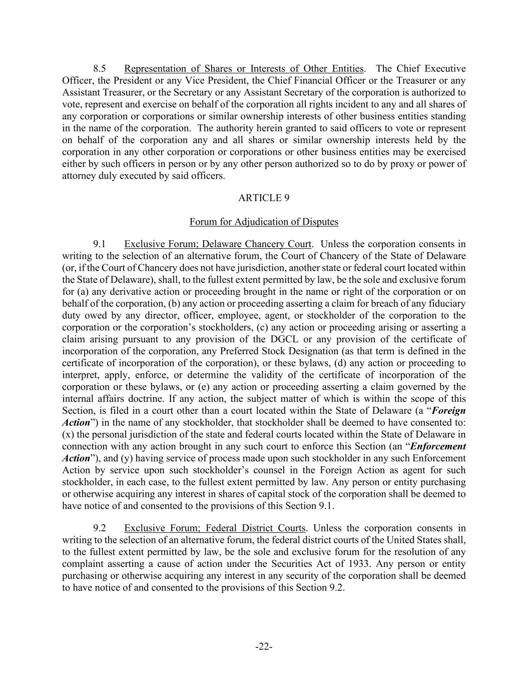 -22- 8.5 Representation of Shares or Interests of Other Entities. The Chief Executive Officer, the President or any Vice President, the Chief Financial Officer or the Treasurer or any Assistant Treasurer, or the Secretary or any Assistant Secretary of the corporation is authorized to vote, represent and exercise on behalf of the corporation all rights incident to any and all shares of any corporation or corporations or similar ownership interests of other business entities standing in the name of the corporation. The authority herein granted to said officers to vote or represent on behalf of the corporation any and all shares or similar ownership interests held by the corporation in any other corporation or corporations or other business entities may be exercised either by such officers in person or by any other person authorized so to do by proxy or power of attorney duly executed by said officers. ARTICLE 9 Forum for Adjudication of Disputes 9.1 Exclusive Forum; Delaware Chancery Court. Unless the corporation consents in writing to the selection of an alternative forum, the Court of Chancery of the State of Delaware (or, if the Court of Chancery does not have jurisdiction, another state or federal court located within the State of Delaware), shall, to the fullest extent permitted by law, be the sole and exclusive forum for (a) any derivative action or proceeding brought in the name or right of the corporation or on behalf of the corporation, (b) any action or proceeding asserting a claim for breach of any fiduciary duty owed by any director, officer, employee, agent, or stockholder of the corporation to the corporation or the corporation’s stockholders, (c) any action or proceeding arising or asserting a claim arising pursuant to any provision of the DGCL or any provision of the certificate of incorporation of the corporation, any Preferred Stock Designation (as that term is defined in the certificate of incorporation of the corporation), or these bylaws, (d) any action or proceeding to interpret, apply, enforce, or determine the validity of the certificate of incorporation of the corporation or these bylaws, or (e) any action or proceeding asserting a claim governed by the internal affairs doctrine. If any action, the subject matter of which is within the scope of this Section, is filed in a court other than a court located within the State of Delaware (a “Foreign Action”) in the name of any stockholder, that stockholder shall be deemed to have consented to: (x) the personal jurisdiction of the state and federal courts located within the State of Delaware in connection with any action brought in any such court to enforce this Section (an “Enforcement Action”), and (y) having service of process made upon such stockholder in any such Enforcement Action by service upon such stockholder’s counsel in the Foreign Action as agent for such stockholder, in each case, to the fullest extent permitted by law. Any person or entity purchasing or otherwise acquiring any interest in shares of capital stock of the corporation shall be deemed to have notice of and consented to the provisions of this Section 9.1. 9.2 Exclusive Forum; Federal District Courts. Unless the corporation consents in writing to the selection of an alternative forum, the federal district courts of the United States shall, to the fullest extent permitted by law, be the sole and exclusive forum for the resolution of any complaint asserting a cause of action under the Securities Act of 1933. Any person or entity purchasing or otherwise acquiring any interest in any security of the corporation shall be deemed to have notice of and consented to the provisions of this Section 9.2.