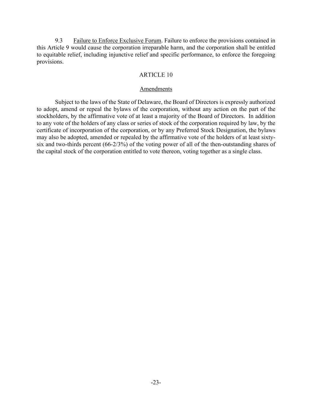 -23- 9.3 Failure to Enforce Exclusive Forum. Failure to enforce the provisions contained in this Article 9 would cause the corporation irreparable harm, and the corporation shall be entitled to equitable relief, including injunctive relief and specific performance, to enforce the foregoing provisions. ARTICLE 10 Amendments Subject to the laws of the State of Delaware, the Board of Directors is expressly authorized to adopt, amend or repeal the bylaws of the corporation, without any action on the part of the stockholders, by the affirmative vote of at least a majority of the Board of Directors. In addition to any vote of the holders of any class or series of stock of the corporation required by law, by the certificate of incorporation of the corporation, or by any Preferred Stock Designation, the bylaws may also be adopted, amended or repealed by the affirmative vote of the holders of at least sixty- six and two-thirds percent (66-2/3%) of the voting power of all of the then-outstanding shares of the capital stock of the corporation entitled to vote thereon, voting together as a single class.