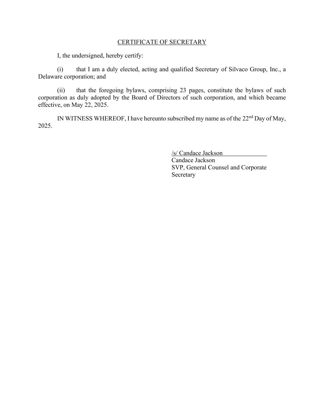CERTIFICATE OF SECRETARY I, the undersigned, hereby certify: (i) that I am a duly elected, acting and qualified Secretary of Silvaco Group, Inc., a Delaware corporation; and (ii) that the foregoing bylaws, comprising 23 pages, constitute the bylaws of such corporation as duly adopted by the Board of Directors of such corporation, and which became effective, on May 22, 2025. IN WITNESS WHEREOF, I have hereunto subscribed my name as of the 22nd Day of May, 2025. /s/ Candace Jackson Candace Jackson SVP, General Counsel and Corporate Secretary