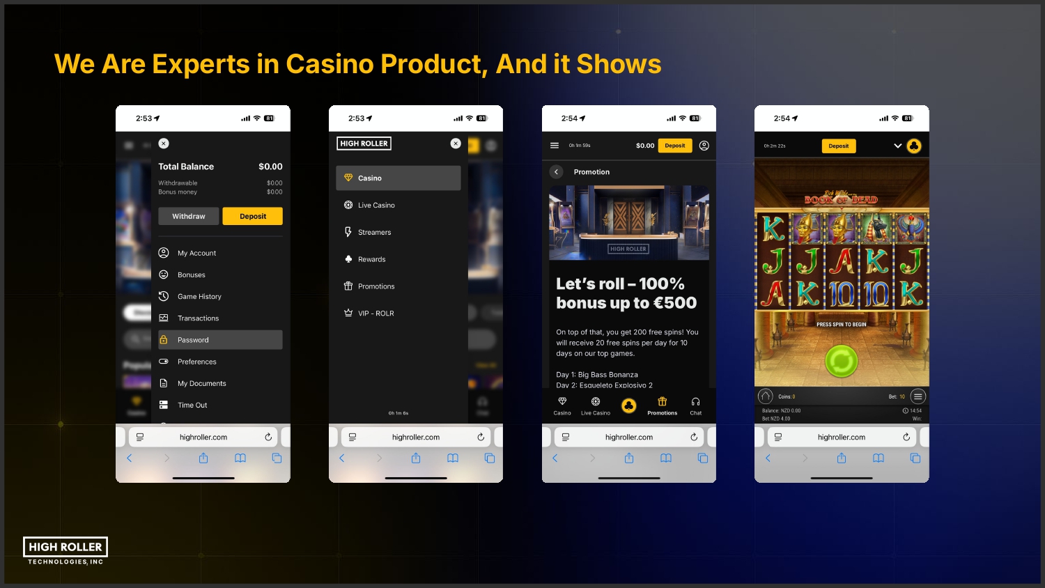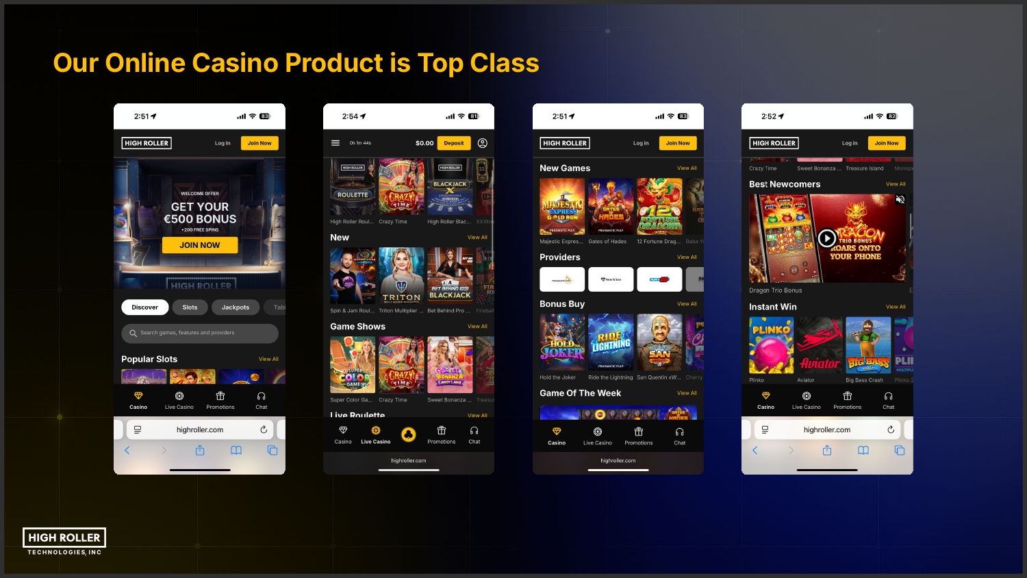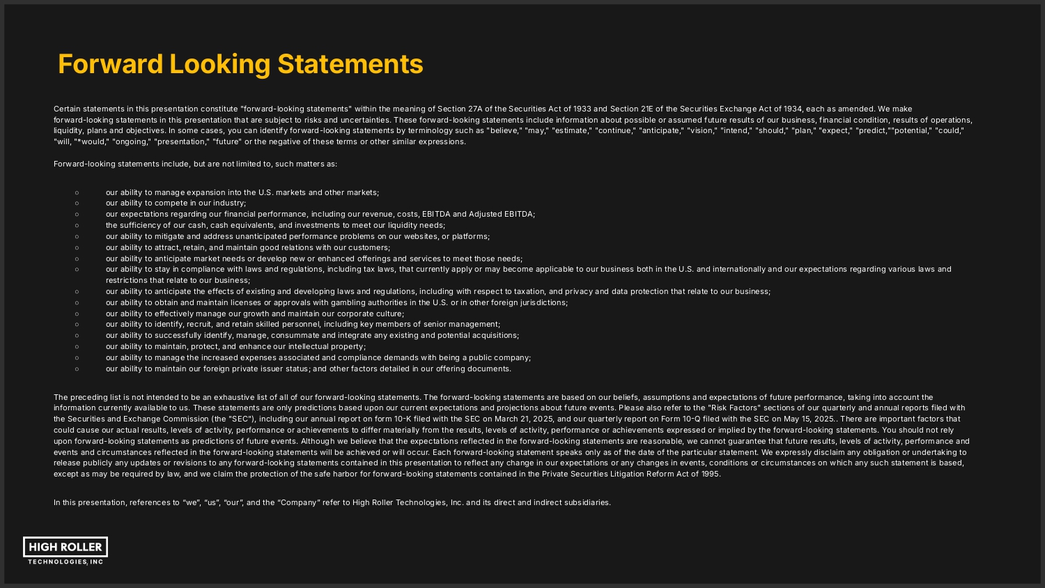 Forward Looking Statements Certain statements in this presentation constitute "forward-looking statements" within the meaning of Section 27A of the Securities Act of 1933 and Section 21E of the Securities Exchange Act of 1934, each as amended. We make forward-looking statements in this presentation that are subject to risks and uncertainties. These forward-looking statements include information about possible or assumed future results of our business, financial condition, results of operations, liquidity, plans and objectives. In some cases, you can identify forward-looking statements by terminology such as "believe," "may," "estimate," "continue," "anticipate," "vision," "intend," "should," "plan," "expect," "predict,""potential," "could," "will, "*would," "ongoing," "presentation," "future" or the negative of these terms or other similar expressions. Forward-looking statements include, but are not limited to, such matters as: ○ ○ ○ ○ ○ ○ ○ ○ ○ ○ ○ ○ ○ ○ ○ ○ our ability to manage expansion into the U.S. markets and other markets; our ability to compete in our industry; our expectations regarding our financial performance, including our revenue, costs, EBITDA and Adjusted EBITDA; the sufficiency of our cash, cash equivalents, and investments to meet our liquidity needs; our ability to mitigate and address unanticipated performance problems on our websites, or platforms; our ability to attract, retain, and maintain good relations with our customers; our ability to anticipate market needs or develop new or enhanced offerings and services to meet those needs; our ability to stay in compliance with laws and regulations, including tax laws, that currently apply or may become applicable to our business both in the U.S. and internationally and our expectations regarding various laws and restrictions that relate to our business; our ability to anticipate the effects of existing and developing laws and regulations, including with respect to taxation, and privacy and data protection that relate to our business; our ability to obtain and maintain licenses or approvals with gambling authorities in the U.S. or in other foreign jurisdictions; our ability to effectively manage our growth and maintain our corporate culture; our ability to identify, recruit, and retain skilled personnel, including key members of senior management; our ability to successfully identify, manage, consummate and integrate any existing and potential acquisitions; our ability to maintain, protect, and enhance our intellectual property; our ability to manage the increased expenses associated and compliance demands with being a public company; our ability to maintain our foreign private issuer status; and other factors detailed in our offering documents. The preceding list is not intended to be an exhaustive list of all of our forward-looking statements. The forward-looking statements are based on our beliefs, assumptions and expectations of future performance, taking into account the information currently available to us. These statements are only predictions based upon our current expectations and projections about future events. Please also refer to the "Risk Factors" sections of our quarterly and annual reports filed with the Securities and Exchange Commission (the "SEC"), including our annual report on form 10-K filed with the SEC on March 21, 2025, and our quarterly report on Form 10-Q filed with the SEC on May 15, 2025.. There are important factors that could cause our actual results, levels of activity, performance or achievements to differ materially from the results, levels of activity, performance or achievements expressed or implied by the forward-looking statements. You should not rely upon forward-looking statements as predictions of future events. Although we believe that the expectations reflected in the forward-looking statements are reasonable, we cannot guarantee that future results, levels of activity, performance and events and circumstances reflected in the forward-looking statements will be achieved or will occur. Each forward-looking statement speaks only as of the date of the particular statement. We expressly disclaim any obligation or undertaking to release publicly any updates or revisions to any forward-looking statements contained in this presentation to reflect any change in our expectations or any changes in events, conditions or circumstances on which any such statement is based, except as may be required by law, and we claim the protection of the safe harbor for forward-looking statements contained in the Private Securities Litigation Reform Act of 1995. In this presentation, references to “weˮ, “usˮ, “ourˮ, and the “Companyˮ refer to High Roller Technologies, Inc. and its direct and indirect subsidiaries.
