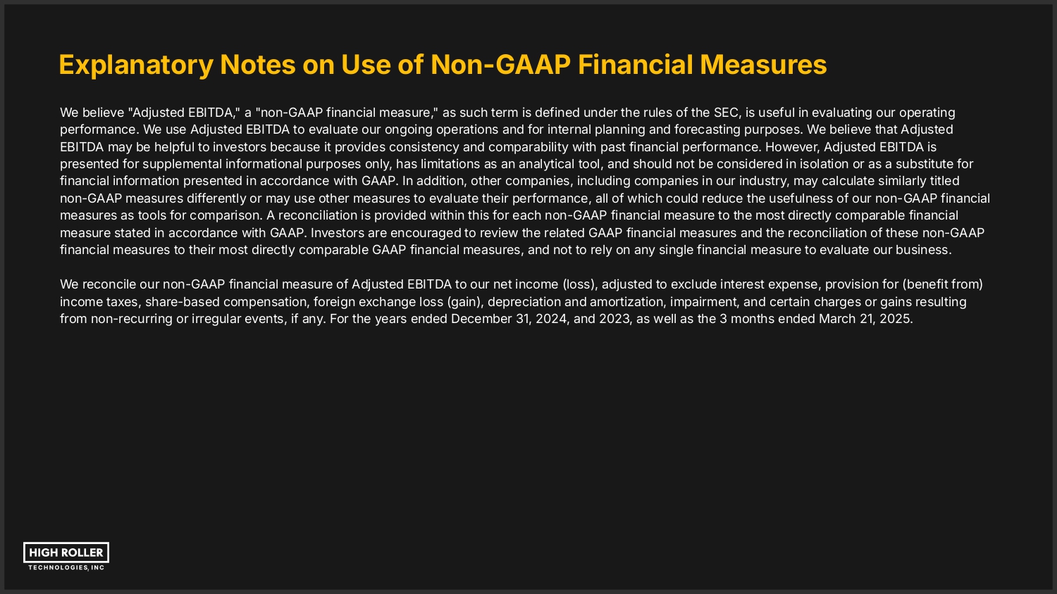 Explanatory Notes on Use of Non-GAAP Financial Measures We believe "Adjusted EBITDA," a "non-GAAP financial measure," as such term is defined under the rules of the SEC, is useful in evaluating our operating performance. We use Adjusted EBITDA to evaluate our ongoing operations and for internal planning and forecasting purposes. We believe that Adjusted EBITDA may be helpful to investors because it provides consistency and comparability with past financial performance. However, Adjusted EBITDA is presented for supplemental informational purposes only, has limitations as an analytical tool, and should not be considered in isolation or as a substitute for financial information presented in accordance with GAAP. In addition, other companies, including companies in our industry, may calculate similarly titled non-GAAP measures differently or may use other measures to evaluate their performance, all of which could reduce the usefulness of our non-GAAP financial measures as tools for comparison. A reconciliation is provided within this for each non-GAAP financial measure to the most directly comparable financial measure stated in accordance with GAAP. Investors are encouraged to review the related GAAP financial measures and the reconciliation of these non-GAAP financial measures to their most directly comparable GAAP financial measures, and not to rely on any single financial measure to evaluate our business. We reconcile our non-GAAP financial measure of Adjusted EBITDA to our net income (loss), adjusted to exclude interest expense, provision for (benefit from) income taxes, share-based compensation, foreign exchange loss (gain), depreciation and amortization, impairment, and certain charges or gains resulting from non-recurring or irregular events, if any. For the years ended December 31, 2024, and 2023, as well as the 3 months ended March 21, 2025.