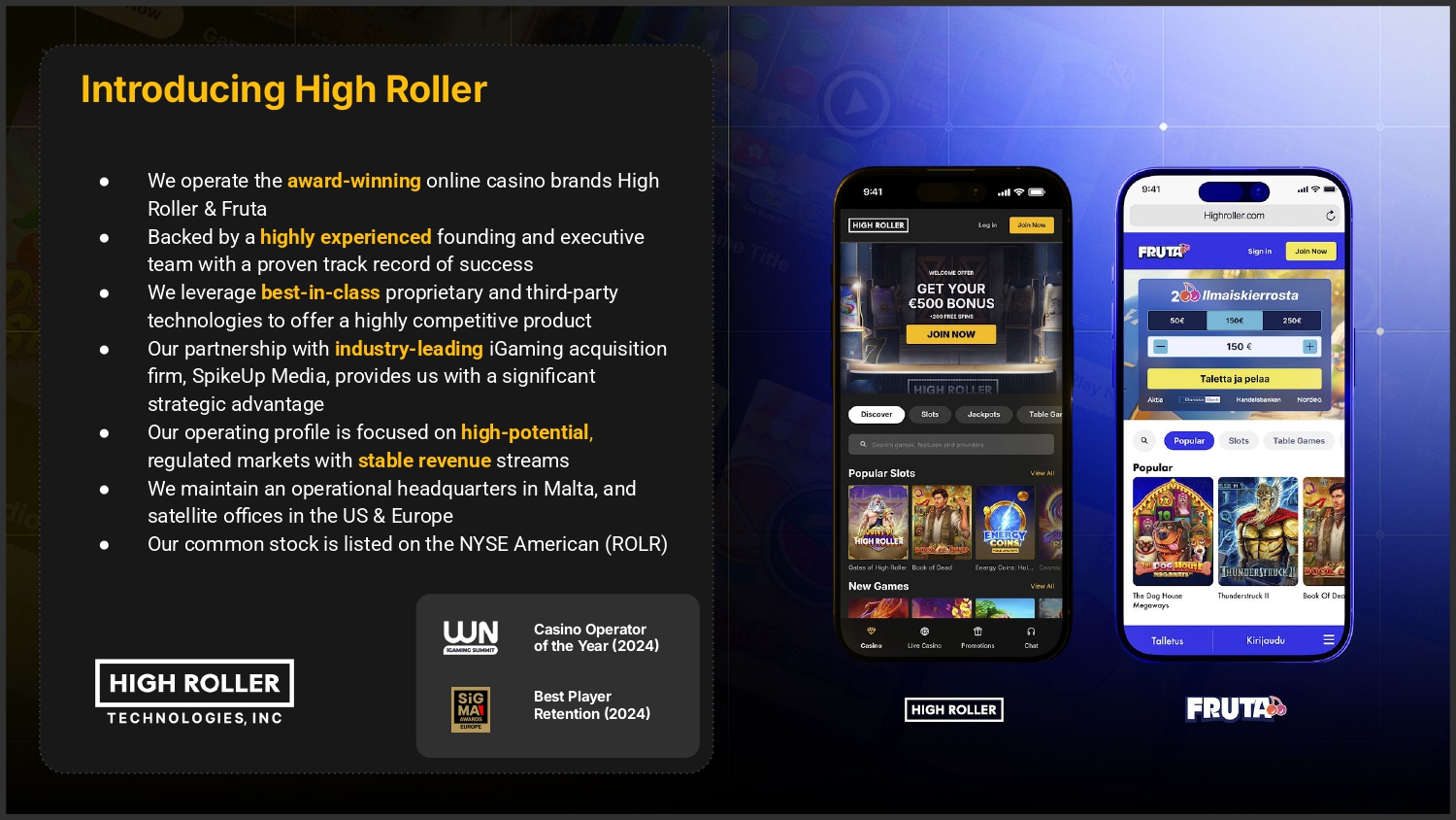 Introducing High Roller ● ● ● ● ● ● ● We operate the award-winning online casino brands High Roller & Fruta Backed by a highly experienced founding and executive team with a proven track record of success We leverage best-in-class proprietary and third-party technologies to offer a highly competitive product Our partnership with industry-leading iGaming acquisition firm, SpikeUp Media, provides us with a significant strategic advantage Our operating profile is focused on high-potential, regulated markets with stable revenue streams We maintain an operational headquarters in Malta, and satellite offces in the US & Europe Our common stock is listed on the NYSE American (ROLR) Casino Operator of the Year 2024 Best Player Retention 2024