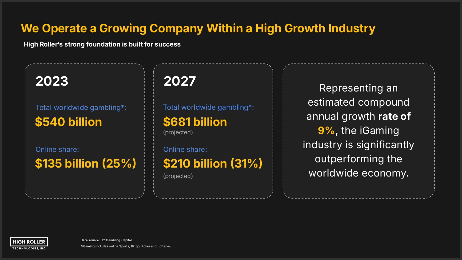 We Operate a Growing Company Within a High Growth Industry High Rollerʼs strong foundation is built for success 2023 2027 Total worldwide gambling*: Total worldwide gambling*: $540 billion $681 billion Online share: Online share: $135 billion 25% $210 billion 31% (projected) (projected) Data source: H2 Gambling Capital. *iGaming includes online Sports, Bingo, Poker and Lotteries. Representing an estimated compound annual growth rate of 9%, the iGaming industry is significantly outperforming the worldwide economy.