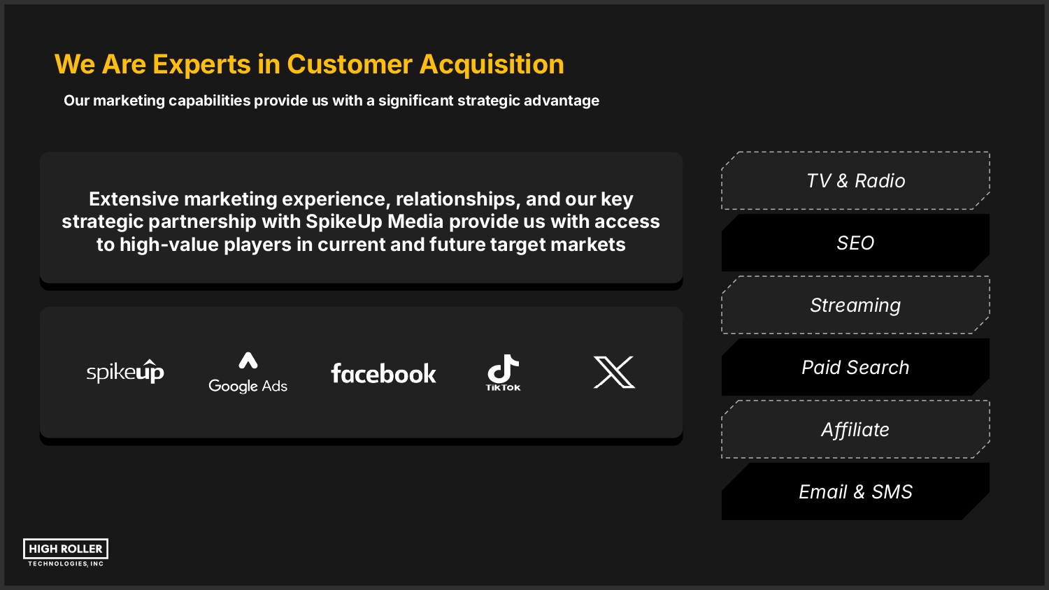 We Are Experts in Customer Acquisition Our marketing capabilities provide us with a significant strategic advantage Extensive marketing experience, relationships, and our key strategic partnership with SpikeUp Media provide us with access to high-value players in current and future target markets TV & Radio SEO Streaming Paid Search Affiliate Email & SMS