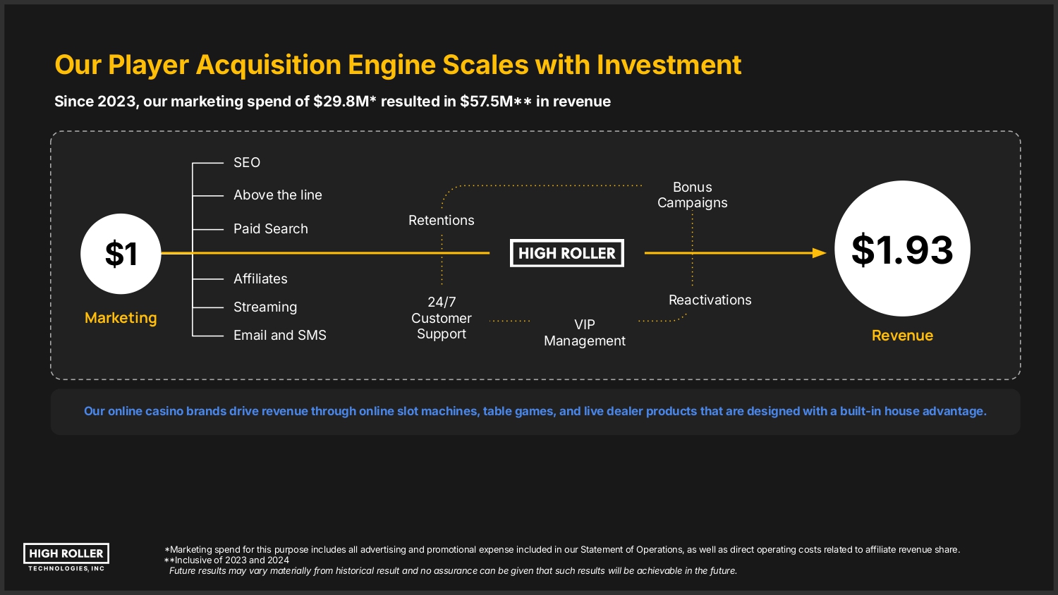 Our Player Acquisition Engine Scales with Investment Since 2023, our marketing spend of $29.8M* resulted in $57.5M in revenue SEO Bonus Campaigns Above the line $1 Marketing Paid Search Retentions $1.93 Affiliates Streaming Email and SMS 24/7 Customer Support Reactivations VIP Management Revenue Our online casino brands drive revenue through online slot machines, table games, and live dealer products that are designed with a built-in house advantage. Marketing spend for this purpose includes all advertising and promotional expense included in our Statement of Operations, as well as direct operating costs related to affiliate revenue share. Inclusive of 2023 and 2024 Future results may vary materially from historical result and no assurance can be given that such results will be achievable in the future.