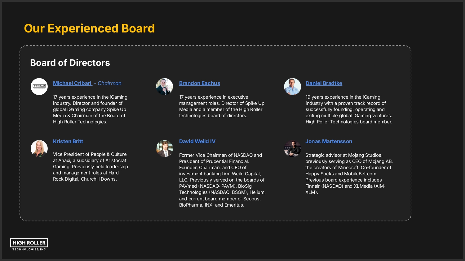 Our Experienced Board Board of Directors Michael Cribari - Chairman Brandon Eachus Daniel Bradtke 17 years experience in the iGaming industry. Director and founder of global iGaming company Spike Up Media & Chairman of the Board of High Roller Technologies. 17 years experience in executive management roles. Director of Spike Up Media and a member of the High Roller technologies board of directors. 19 years experience in the iGaming industry with a proven track record of successfully founding, operating and exiting multiple global iGaming ventures. High Roller Technologies board member. Kristen Britt David Weild IV Jonas Martensson Vice President of People & Culture at Anaxi, a subsidiary of Aristocrat Gaming. Previously held leadership and management roles at Hard Rock Digital, Churchill Downs. Former Vice Chairman of NASDAQ and President of Prudential Financial. Founder, Chairman, and CEO of investment banking firm Weild Capital, LLC. Previously served on the boards of PAVmed NASDAQ PAVM, BioSig Technologies NASDAQ BSGM, Helium, and current board member of Scopus, BioPharma, INX, and Emeritus. Strategic advisor at Mojang Studios, previously serving as CEO of Mojang AB, the creators of Minecraft. Co-founder of Happy Socks and MobileBet.com. Previous board experience includes Finnair NASDAQ) and XLMedia AIM XLM.