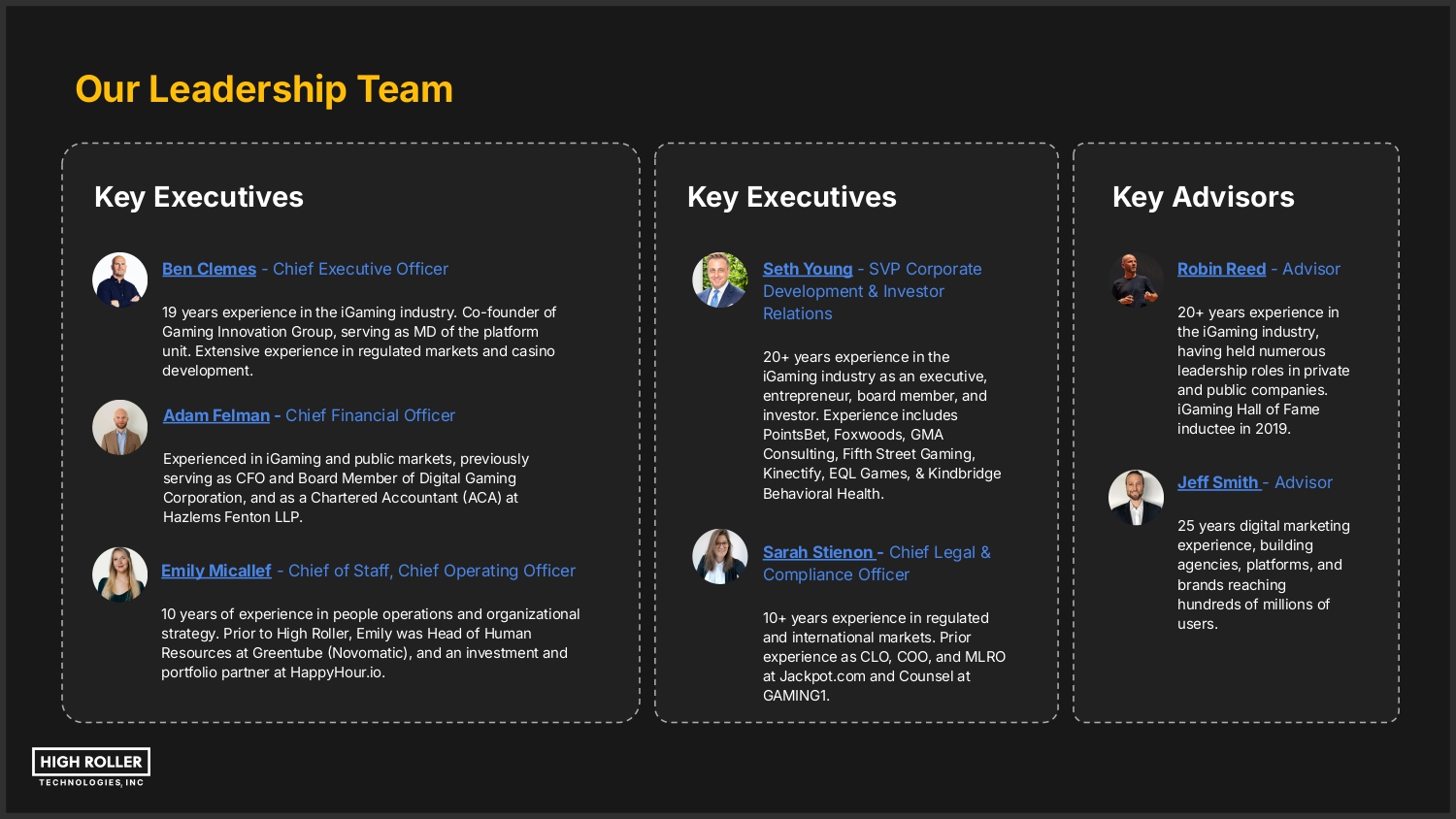 Our Leadership Team Key Executives Ben Clemes - Chief Executive Officer 19 years experience in the iGaming industry. Co-founder of Gaming Innovation Group, serving as MD of the platform unit. Extensive experience in regulated markets and casino development. Adam Felman - Chief Financial Officer Experienced in iGaming and public markets, previously serving as CFO and Board Member of Digital Gaming Corporation, and as a Chartered Accountant ACA) at Hazlems Fenton LLP. Emily Micallef - Chief of Staff, Chief Operating Officer 10 years of experience in people operations and organizational strategy. Prior to High Roller, Emily was Head of Human Resources at Greentube Novomatic), and an investment and portfolio partner at HappyHour.io. Key Executives Seth Young - SVP Corporate Development & Investor Relations 20+ years experience in the iGaming industry as an executive, entrepreneur, board member, and investor. Experience includes PointsBet, Foxwoods, GMA Consulting, Fifth Street Gaming, Kinectify, EQL Games, & Kindbridge Behavioral Health. Sarah Stienon - Chief Legal & Compliance Officer 10+ years experience in regulated and international markets. Prior experience as CLO, COO, and MLRO at Jackpot.com and Counsel at GAMING1. Key Advisors Robin Reed - Advisor 20+ years experience in the iGaming industry, having held numerous leadership roles in private and public companies. iGaming Hall of Fame inductee in 2019. Jeff Smith - Advisor 25 years digital marketing experience, building agencies, platforms, and brands reaching hundreds of millions of users.