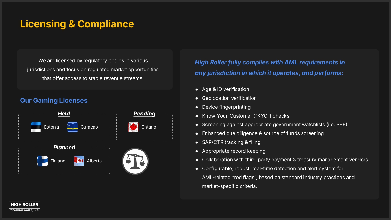 Licensing & Compliance We are licensed by regulatory bodies in various jurisdictions and focus on regulated market opportunities that offer access to stable revenue streams. High Roller fully complies with AML requirements in any jurisdiction in which it operates, and performs: ● Age & ID verification ● Geolocation verification Our Gaming Licenses Held Estonia ● Device fingerprinting Pending Curacao Ontario ● Know-Your-Customer (“KYCˮ) checks ● Screening against appropriate government watchlists (i.e. PEP ● Enhanced due diligence & source of funds screening ● SAR/CTR tracking & filing Planned Finland ● Appropriate record keeping Alberta ● Collaboration with third-party payment & treasury management vendors ● Configurable, robust, real-time detection and alert system for AML-related “red flagsˮ, based on standard industry practices and market-specific criteria.