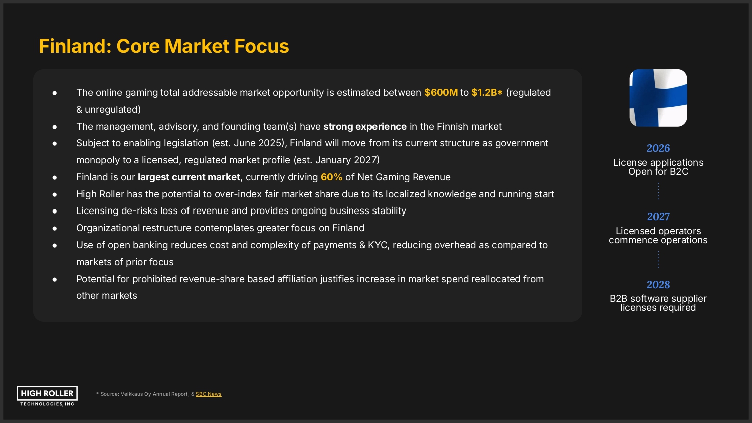 Finland: Core Market Focus ● The online gaming total addressable market opportunity is estimated between $600M to $1.2B (regulated & unregulated) ● The management, advisory, and founding team(s) have strong experience in the Finnish market ● Subject to enabling legislation (est. June 2025, Finland will move from its current structure as government monopoly to a licensed, regulated market profile (est. January 2027 ● Finland is our largest current market, currently driving 60% of Net Gaming Revenue ● High Roller has the potential to over-index fair market share due to its localized knowledge and running start ● Licensing de-risks loss of revenue and provides ongoing business stability ● Organizational restructure contemplates greater focus on Finland ● Use of open banking reduces cost and complexity of payments & KYC, reducing overhead as compared to 2026 License applications Open for B2C 2027 Licensed operators commence operations markets of prior focus ● Potential for prohibited revenue-share based affiliation justifies increase in market spend reallocated from other markets * Source: Veikkaus Oy Annual Report, & SBC News 2028 B2B software supplier licenses required