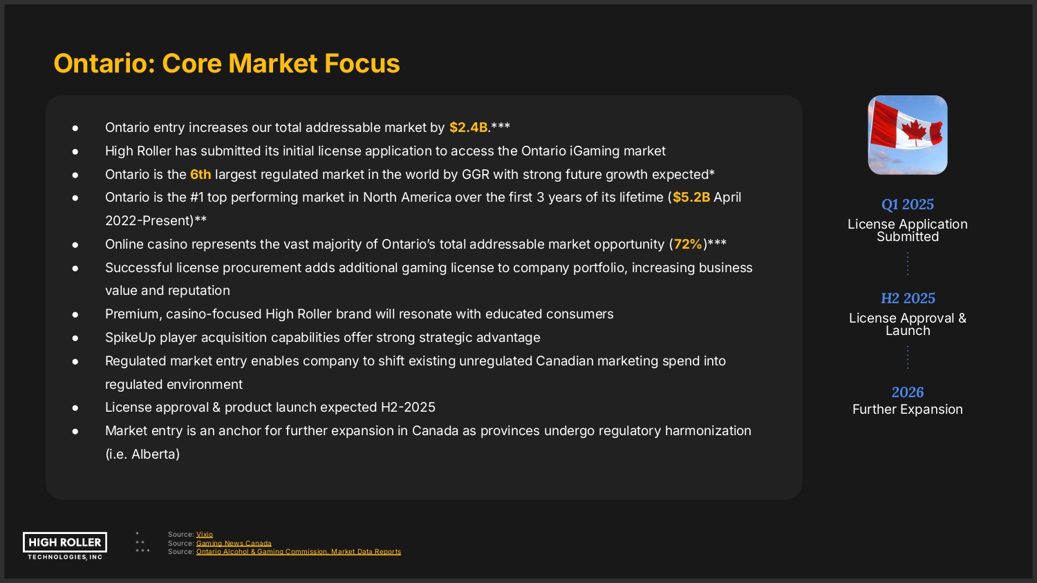 Ontario: Core Market Focus ● Ontario entry increases our total addressable market by $2.4B.*** ● High Roller has submitted its initial license application to access the Ontario iGaming market ● Ontario is the 6th largest regulated market in the world by GGR with strong future growth expected* ● Ontario is the #1 top performing market in North America over the first 3 years of its lifetime ($5.2B April 2022-Present)** ● Online casino represents the vast majority of Ontarioʼs total addressable market opportunity (72%)*** ● Successful license procurement adds additional gaming license to company portfolio, increasing business value and reputation ● Premium, casino-focused High Roller brand will resonate with educated consumers ● SpikeUp player acquisition capabilities offer strong strategic advantage ● Regulated market entry enables company to shift existing unregulated Canadian marketing spend into regulated environment ● License approval & product launch expected H2-2025 ● Market entry is an anchor for further expansion in Canada as provinces undergo regulatory harmonization (i.e. Alberta) * ** *** Source: Vixio Source: Gaming News Canada Source: Ontario Alcohol & Gaming Commission, Market Data Reports Q1 2025 License Application Submitted H2 2025 License Approval & Launch 2026 Further Expansion