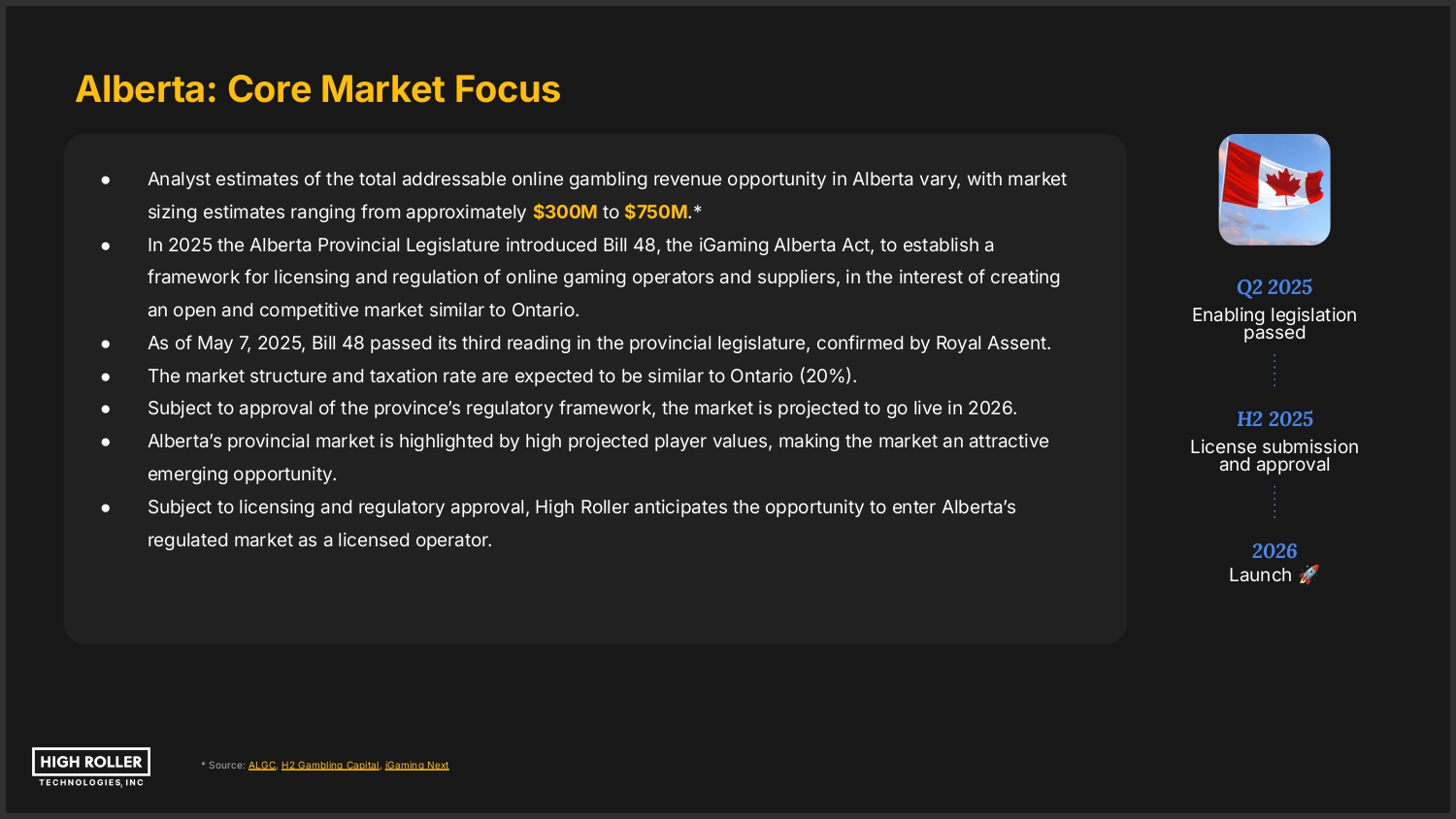 Alberta: Core Market Focus ● Analyst estimates of the total addressable online gambling revenue opportunity in Alberta vary, with market sizing estimates ranging from approximately $300M to $750M.* ● In 2025 the Alberta Provincial Legislature introduced Bill 48, the iGaming Alberta Act, to establish a framework for licensing and regulation of online gaming operators and suppliers, in the interest of creating an open and competitive market similar to Ontario. ● As of May 7, 2025, Bill 48 passed its third reading in the provincial legislature, confirmed by Royal Assent. ● The market structure and taxation rate are expected to be similar to Ontario 20%. ● Subject to approval of the provinceʼs regulatory framework, the market is projected to go live in 2026. ● Albertaʼs provincial market is highlighted by high projected player values, making the market an attractive emerging opportunity. ● Q2 2025 Enabling legislation passed H2 2025 License submission and approval Subject to licensing and regulatory approval, High Roller anticipates the opportunity to enter Albertaʼs regulated market as a licensed operator. 2026 Launch * Source: ALGC, H2 Gambling Capital, iGaming Next