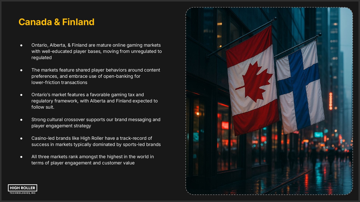 Canada & Finland ● Ontario, Alberta, & Finland are mature online gaming markets with well-educated player bases, moving from unregulated to regulated ● The markets feature shared player behaviors around content preferences, and embrace use of open-banking for lower-friction transactions ● Ontarioʼs market features a favorable gaming tax and regulatory framework, with Alberta and Finland expected to follow suit. ● Strong cultural crossover supports our brand messaging and player engagement strategy ● Casino-led brands like High Roller have a track-record of success in markets typically dominated by sports-led brands ● All three markets rank amongst the highest in the world in terms of player engagement and customer value