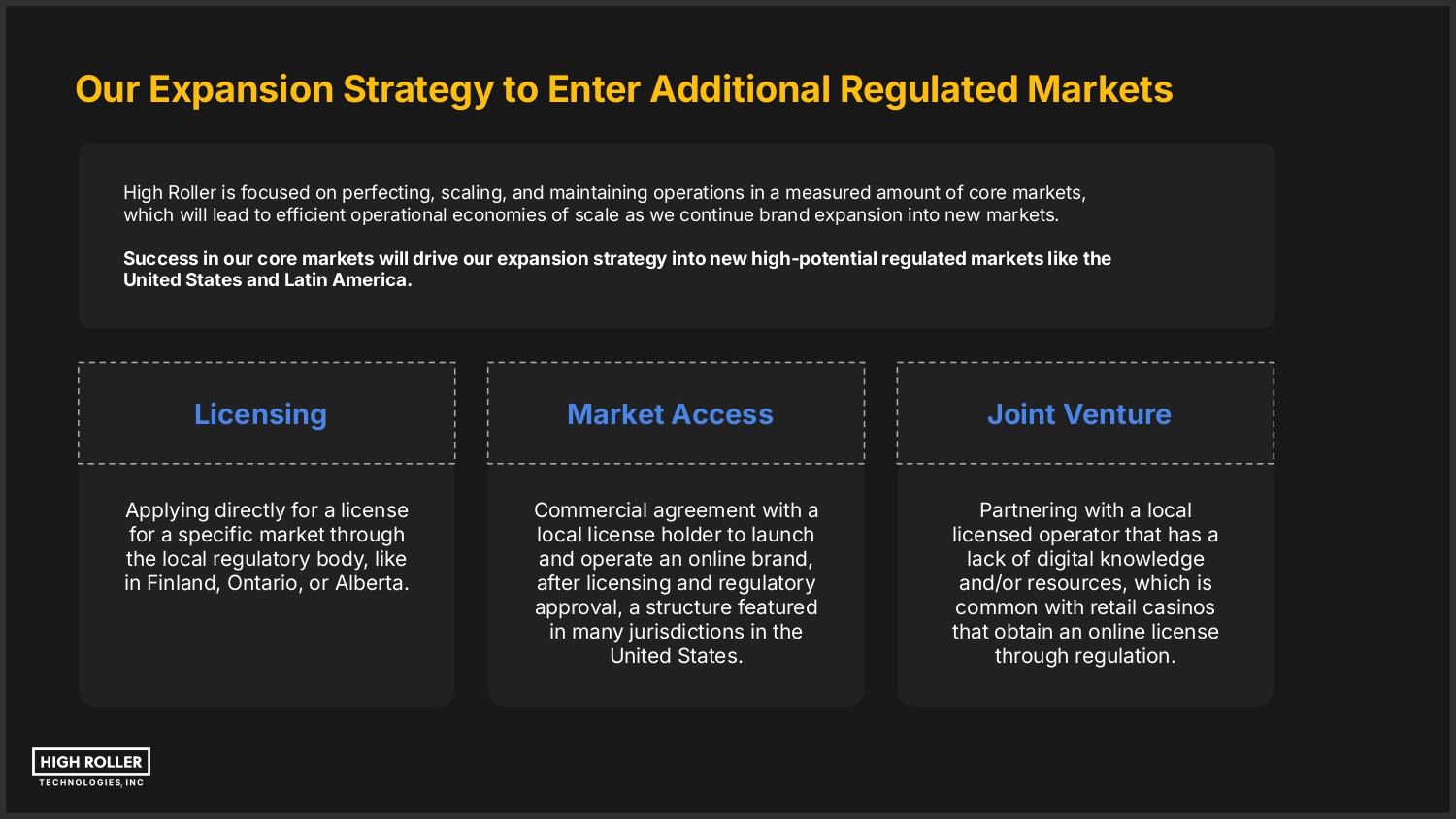 Our Expansion Strategy to Enter Additional Regulated Markets High Roller is focused on perfecting, scaling, and maintaining operations in a measured amount of core markets, which will lead to efficient operational economies of scale as we continue brand expansion into new markets. Success in our core markets will drive our expansion strategy into new high-potential regulated markets like the United States and Latin America. Licensing Market Access Joint Venture Applying directly for a license for a specific market through the local regulatory body, like in Finland, Ontario, or Alberta. Commercial agreement with a local license holder to launch and operate an online brand, after licensing and regulatory approval, a structure featured in many jurisdictions in the United States. Partnering with a local licensed operator that has a lack of digital knowledge and/or resources, which is common with retail casinos that obtain an online license through regulation.