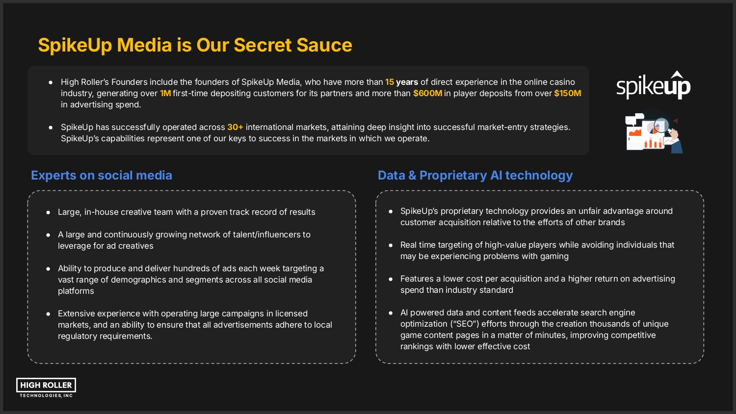 SpikeUp Media is Our Secret Sauce ● High Rollerʼs Founders include the founders of SpikeUp Media, who have more than 15 years of direct experience in the online casino industry, generating over 1M first-time depositing customers for its partners and more than $600M in player deposits from over $150M in advertising spend. ● SpikeUp has successfully operated across 30 international markets, attaining deep insight into successful market-entry strategies. SpikeUpʼs capabilities represent one of our keys to success in the markets in which we operate. Experts on social media ● Large, in-house creative team with a proven track record of results ● A large and continuously growing network of talent/influencers to leverage for ad creatives ● Ability to produce and deliver hundreds of ads each week targeting a vast range of demographics and segments across all social media platforms ● Extensive experience with operating large campaigns in licensed markets, and an ability to ensure that all advertisements adhere to local regulatory requirements. Data & Proprietary AI technology ● SpikeUpʼs proprietary technology provides an unfair advantage around customer acquisition relative to the efforts of other brands ● Real time targeting of high-value players while avoiding individuals that may be experiencing problems with gaming ● Features a lower cost per acquisition and a higher return on advertising spend than industry standard ● ● AI powered data and content feeds accelerate search engine optimization (“SEOˮ) efforts through the creation thousands of unique game content pages in a matter of minutes, improving competitive rankings with lower effective cost
