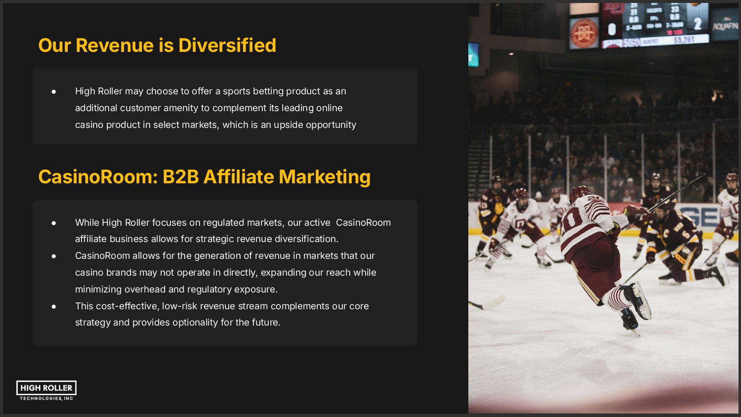 Our Revenue is Diversified ● High Roller may choose to offer a sports betting product as an additional customer amenity to complement its leading online casino product in select markets, which is an upside opportunity CasinoRoom: B2B Affiliate Marketing ● While High Roller focuses on regulated markets, our active CasinoRoom affiliate business allows for strategic revenue diversification. ● CasinoRoom allows for the generation of revenue in markets that our casino brands may not operate in directly, expanding our reach while minimizing overhead and regulatory exposure. ● This cost-effective, low-risk revenue stream complements our core strategy and provides optionality for the future.