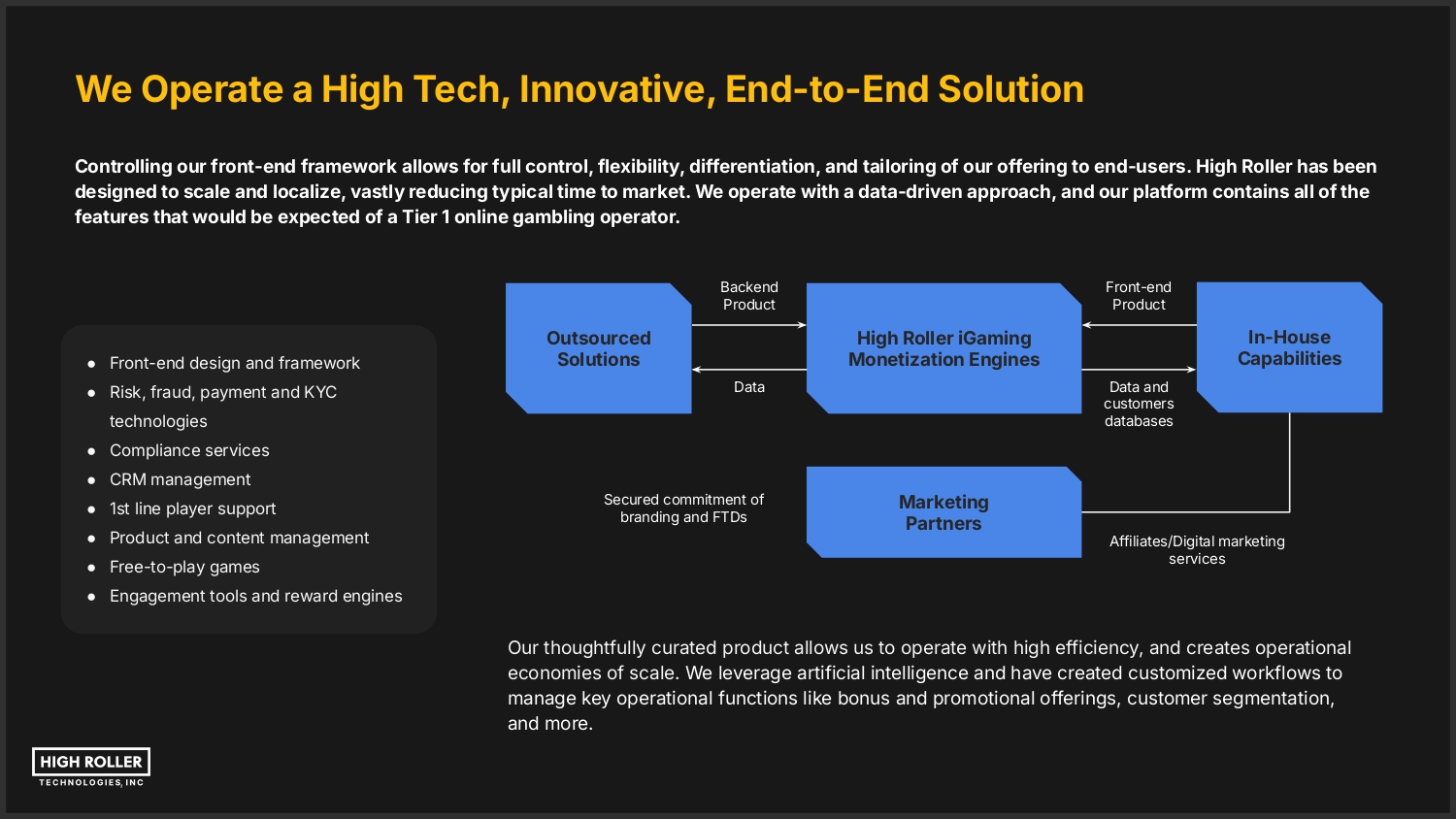 We Operate a High Tech, Innovative, End-to-End Solution Controlling our front-end framework allows for full control, flexibility, differentiation, and tailoring of our offering to end-users. High Roller has been designed to scale and localize, vastly reducing typical time to market. We operate with a data-driven approach, and our platform contains all of the features that would be expected of a Tier 1 online gambling operator. Backend Product ● Front-end design and framework ● Risk, fraud, payment and KYC Outsourced Solutions Front-end Product In-House Capabilities High Roller iGaming Monetization Engines Data Data and customers databases technologies ● Compliance services ● CRM management ● 1st line player support ● Product and content management ● Free-to-play games Secured commitment of branding and FTDs Marketing Partners Affiliates/Digital marketing services ● Engagement tools and reward engines Our thoughtfully curated product allows us to operate with high efficiency, and creates operational economies of scale. We leverage artificial intelligence and have created customized workflows to manage key operational functions like bonus and promotional offerings, customer segmentation, and more.