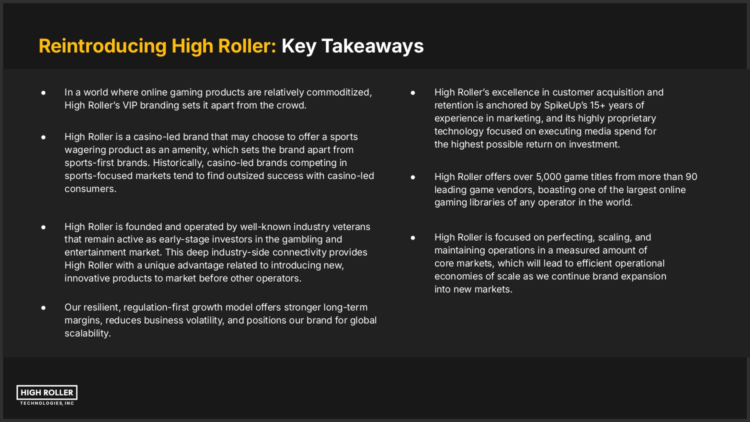 Reintroducing High Roller: Key Takeaways ● In a world where online gaming products are relatively commoditized, High Rollerʼs VIP branding sets it apart from the crowd. ● High Roller is a casino-led brand that may choose to offer a sports wagering product as an amenity, which sets the brand apart from sports-first brands. Historically, casino-led brands competing in sports-focused markets tend to find outsized success with casino-led consumers. ● ● High Roller is founded and operated by well-known industry veterans that remain active as early-stage investors in the gambling and entertainment market. This deep industry-side connectivity provides High Roller with a unique advantage related to introducing new, innovative products to market before other operators. Our resilient, regulation-first growth model offers stronger long-term margins, reduces business volatility, and positions our brand for global scalability. ● High Rollerʼs excellence in customer acquisition and retention is anchored by SpikeUpʼs 15+ years of experience in marketing, and its highly proprietary technology focused on executing media spend for the highest possible return on investment. ● High Roller offers over 5,000 game titles from more than 90 leading game vendors, boasting one of the largest online gaming libraries of any operator in the world. ● High Roller is focused on perfecting, scaling, and maintaining operations in a measured amount of core markets, which will lead to efficient operational economies of scale as we continue brand expansion into new markets.