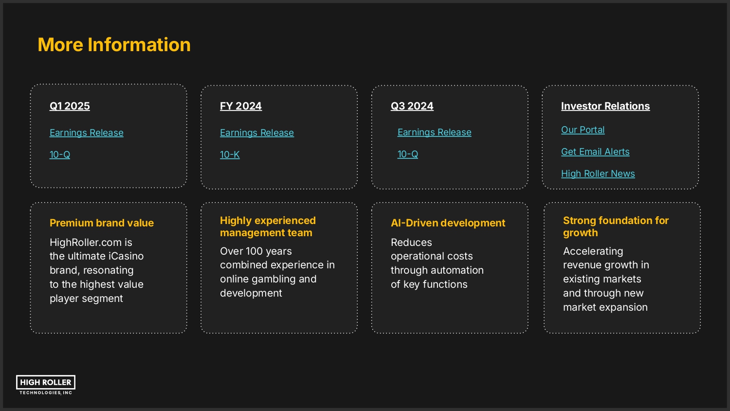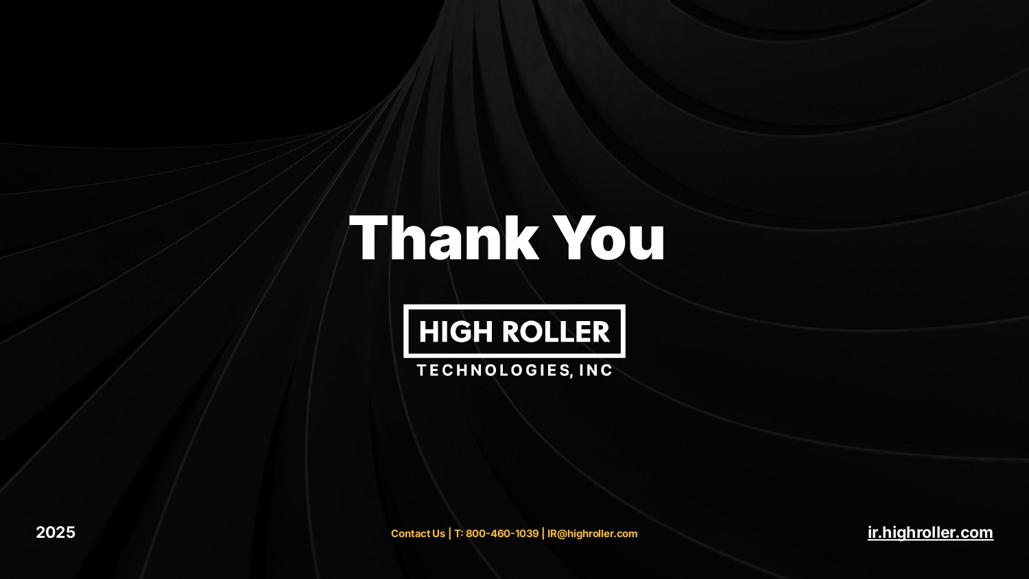 Thank You 2025 Contact Us | T 800-460-1039 | IR@highroller.com ir.highroller.com