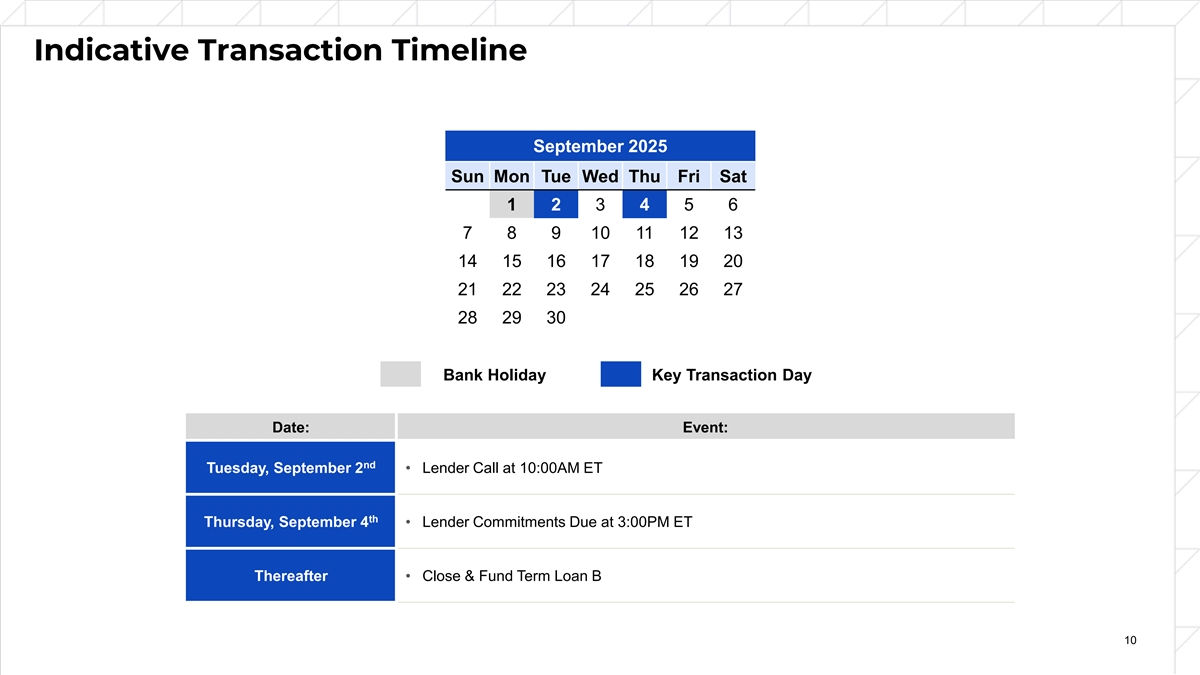 Indicative Transaction Timeline September 2025 Sun Mon Tue Wed Thu Fri Sat 1 2 3 4 5 6 7 8 9 10 11 12 13 14 15 16 17 18 19 20 21 22 23 24 25 26 27 28 29 30 Bank Holiday Key Transaction Day Date: Event: nd Tuesday, September 2 • Lender Call at 10:00AM ET th Thursday, September 4 • Lender Commitments Due at 3:00PM ET Thereafter • Close & Fund Term Loan B 10 10