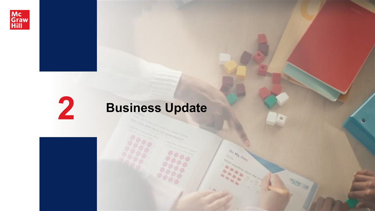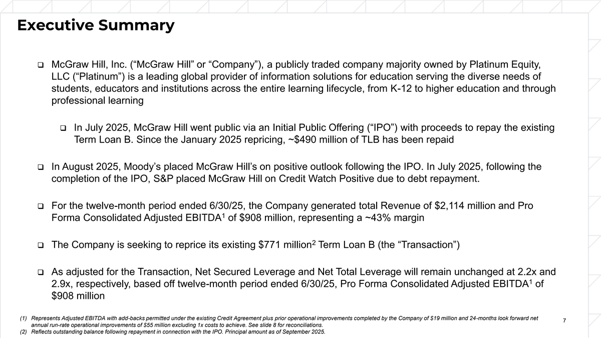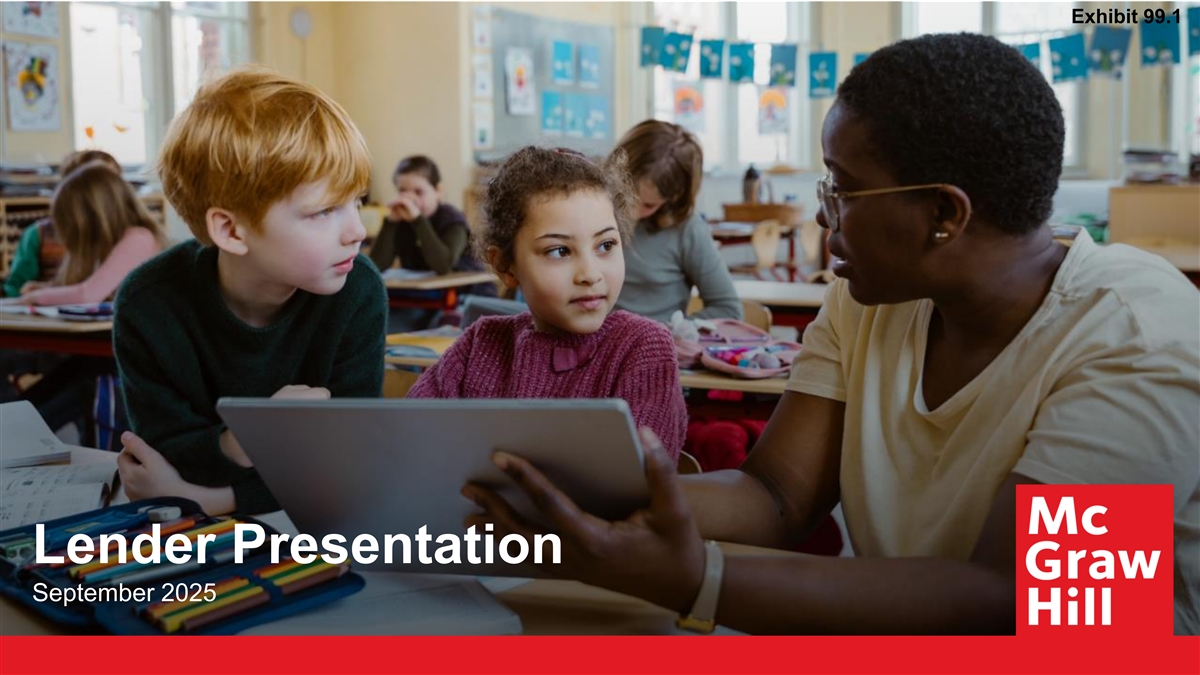 Executive Summary ❑ McGraw Hill, Inc. (“McGraw Hill” or “Company”), a publicly traded company majority owned by Platinum Equity, LLC (“Platinum”) is a leading global provider of information solutions for education serving the diverse needs of students, educators and institutions across the entire learning lifecycle, from K-12 to higher education and through professional learning ❑ In July 2025, McGraw Hill went public via an Initial Public Offering (“IPO”) with proceeds to repay the existing Term Loan B. Since the January 2025 repricing, ~$490 million of TLB has been repaid ❑ In August 2025, Moody’s placed McGraw Hill’s on positive outlook following the IPO. In July 2025, following the completion of the IPO, S&P placed McGraw Hill on Credit Watch Positive due to debt repayment. ❑ For the twelve-month period ended 6/30/25, the Company generated total Revenue of $2,114 million and Pro 1 Forma Consolidated Adjusted EBITDA of $908 million, representing a ~43% margin 2 ❑ The Company is seeking to reprice its existing $771 million Term Loan B (the “Transaction”) ❑ As adjusted for the Transaction, Net Secured Leverage and Net Total Leverage will remain unchanged at 2.2x and 1 2.9x, respectively, based off twelve-month period ended 6/30/25, Pro Forma Consolidated Adjusted EBITDA of $908 million (1) Represents Adjusted EBITDA with add-backs permitted under the existing Credit Agreement plus prior operational improvements completed by the Company of $19 million and 24-months look forward net 7 annual run-rate operational improvements of $55 million excluding 1x costs to achieve. See slide 8 for reconciliations. (2) Reflects outstanding balance following repayment in connection with the IPO. Principal amount as of September 2025.