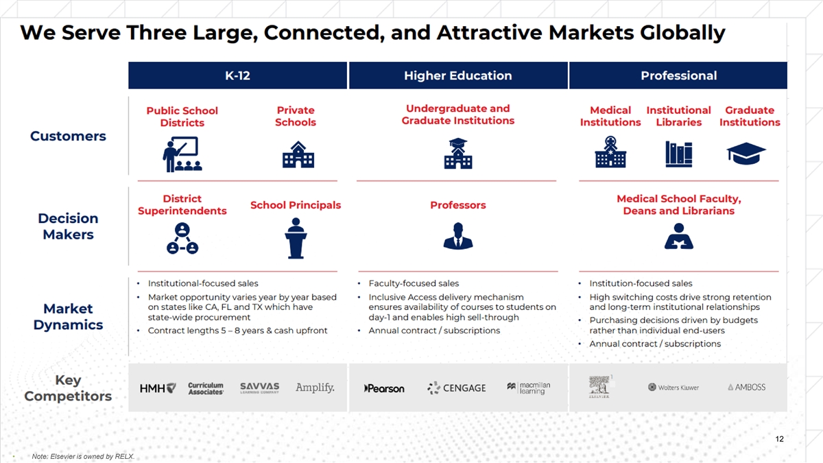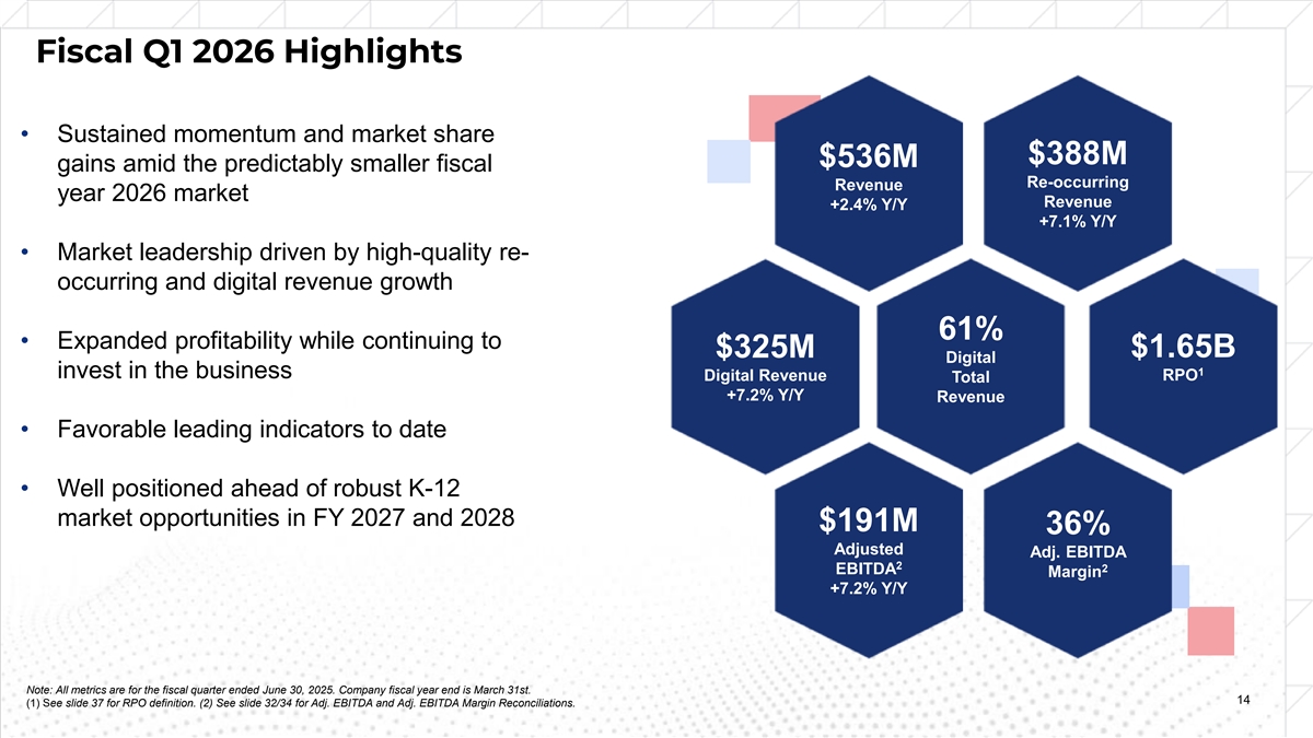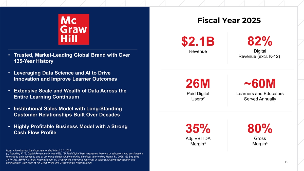 Fiscal Year 2025 82% $2.1B Digital Revenue • Trusted, Market-Leading Global Brand with Over 1 Revenue (excl. K-12) 135-Year History • Leveraging Data Science and AI to Drive Innovation and Improve Learner Outcomes 26M ~60M • Extensive Scale and Wealth of Data Across the Paid Digital Learners and Educators Entire Learning Continuum 2 Users Served Annually • Institutional Sales Model with Long-Standing Customer Relationships Built Over Decades • Highly Profitable Business Model with a Strong 80% 35% Cash Flow Profile Adj. EBITDA Gross 3 4 Margin Margin Note: All metrics for the fiscal year ended March 31, 2025. (1) Including K-12, Digital Revenue Mix was 65%. (2) Paid Digital Users represent learners or educators who purchased a licensed to gain access to one of our many digital solutions during the fiscal year ending March 31, 2025. (3) See slide 34 for Adj. EBITDA Margin Reconciliation. (4) Gross profit is revenue less cost of sales (excluding depreciation and 13 amortization). See slide 38 for Gross Profit and Gross Margin Reconciliation.