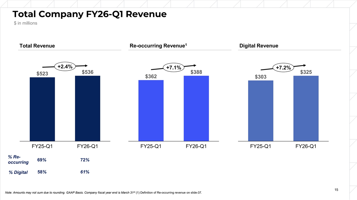 Total Company FY26-Q1 Revenue $ in millions 1 Re-occurring Revenue Digital Revenue Total Revenue +2.4% +7.1% +7.2% $536 $388 $325 $523 $362 $303 FY25-Q1 FY26-Q1 FY25-Q1 FY26-Q1 FY25-Q1 FY26-Q1 % Re- 69% 72% occurring 58% 61% % Digital 15 st Note: Amounts may not sum due to rounding. GAAP Basis. Company fiscal year end is March 31 (1) Definition of Re-occurring revenue on slide-37.