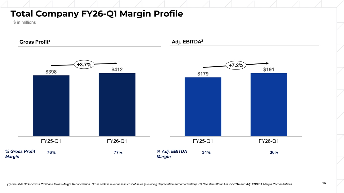Total Company FY26-Q1 Margin Profile $ in millions 2 Gross Profit¹ Adj. EBITDA +3.7% +7.2% $412 $191 $398 $179 FY25-Q1 FY26-Q1 FY25-Q1 FY26-Q1 % Gross Profit % Adj. EBITDA 76% 77% 34% 36% Margin Margin 16 (1) See slide 38 for Gross Profit and Gross Margin Reconciliation. Gross profit is revenue less cost of sales (excluding depreciation and amortization). (2) See slide 32 for Adj. EBITDA and Adj. EBITDA Margin Reconciliations.
