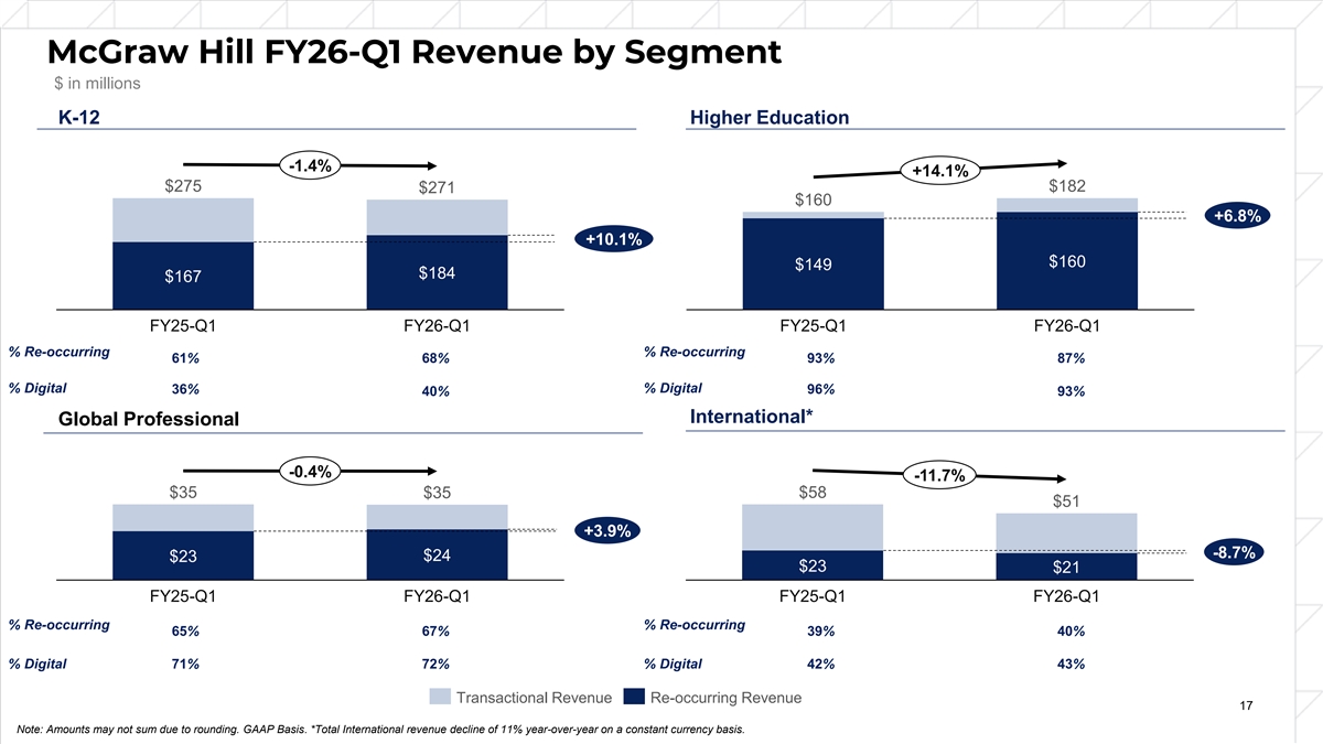 McGraw Hill FY26-Q1 Revenue by Segment $ in millions K-12 Higher Education -1.4% +14.1% $275 $182 $271 $160 +6.8% +10.1% $160 $149 $184 $167 FY25-Q1 FY26-Q1 FY25-Q1 FY26-Q1 % Re-occurring % Re-occurring 61% 68% 93% 87% % Digital % Digital 36% 96% 40% 93% % Digital % Digital International* Global Professional -0.4% -11.7% $35 $35 $58 $51 +3.9% -8.7% $24 $23 $23 $21 FY25-Q1 FY26-Q1 FY25-Q1 FY26-Q1 % Re-occurring % Re-occurring 65% 67% 39% 40% % % Dig Digit ital al 71% 72% % % Dig Digit ital al 42% 43% Transactional Revenue Re-occurring Revenue 17 Note: Amounts may not sum due to rounding. GAAP Basis. *Total International revenue decline of 11% year-over-year on a constant currency basis.