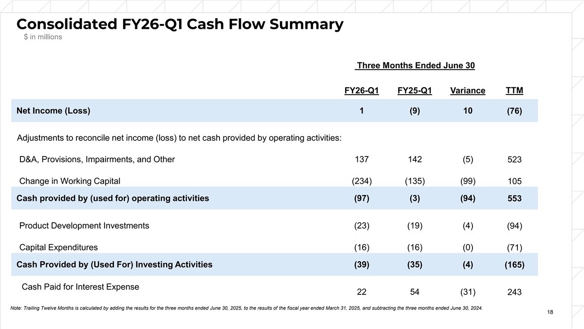 Consolidated FY26-Q1 Cash Flow Summary $ in millions Three Months Ended June 30 FY26-Q1 FY25-Q1 Variance TTM Net Income (Loss) 1 (9) 10 (76) Adjustments to reconcile net income (loss) to net cash provided by operating activities: D&A, Provisions, Impairments, and Other 137 142 (5) 523 Change in Working Capital (234) (135) (99) 105 Cash provided by (used for) operating activities (97) (3) (94) 553 Product Development Investments (23) (19) (4) (94) Capital Expenditures (16) (16) (0) (71) Cash Provided by (Used For) Investing Activities (39) (35) (4) (165) Cash Paid for Interest Expense 22 54 (31) 243 Note: Trailing Twelve Months is calculated by adding the results for the three months ended June 30, 2025, to the results of the fiscal year ended March 31, 2025, and subtracting the three months ended June 30, 2024. 18