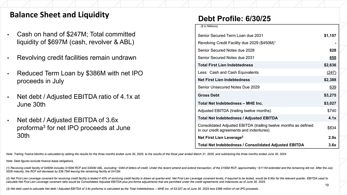 Balance Sheet and Liquidity Debt Profile: 6/30/25 ($ in Millions) • Cash on hand of $247M; Total committed Senior Secured Term Loan due 2031 $1,157 1 Revolving Credit Facility due 2029 ($450M) liquidity of $697M (cash, revolver & ABL) - Senior Secured Notes due 2028 828 Senior Secured Notes due 2031 650 • Revolving credit facilities remain undrawn Total First Lien Indebtedness $2,636 Less: Cash and Cash Equivalents (247) • Reduced Term Loan by $386M with net IPO Net First Lien Indebtedness $2,388 proceeds in July Senior Unsecured Notes Due 2029 639 Gross Debt $3,275 • Net debt / Adjusted EBITDA ratio of 4.1x at Total Net Indebtedness – MHE Inc. $3,027 June 30th Adjusted EBITDA (trailing twelve months) $740 Total Net Indebtedness / Adjusted EBITDA 4.1x • Net debt / Adjusted EBITDA of 3.6x Consolidated Adjusted EBITDA (trailing twelve months as defined 3 $834 proforma for net IPO proceeds at June in our credit agreements and indentures) 2 30th Net First Lien Leverage 2.9x Total Net Indebtedness / Consolidated Adjusted EBITDA 3.6x Note: Trailing Twelve Months is calculated by adding the results for the three months ended June 30, 2025, to the results of the fiscal year ended March 31, 2025, and subtracting the three months ended June 30, 2024. Note: Debt figures exclude finance lease obligations. (1) Revolving credit facility of $450M includes $150M RCF and $300M ABL, excluding ~$4M of letters of credit. Under the recent amend and extend transaction, of the $150M RCF, approximately ~$111M extended and the remaining did not. After the July 2026 maturity, the RCF will decrease by $38.75M leaving the remaining facility at $412M. (2) Net First Lien Leverage covenant for revolving credit facility is tested if 40% of revolving credit facility is drawn at quarter-end. Net First Lien Leverage covenant levels, if required to be tested, would be 6.95x for the relevant quarter. EBITDA used to calculate Net First Lien Leverage covenant ratio would be Consolidated Adjusted EBITDA plus pro-forma adjustments that are permitted under the credit agreements and indentures as of June 30, 2025. 19 (3) Net debt used to calculate Net debt / Adjusted EBITDA of 3.6x proforma is calculated as the Total Indebtedness – MHE Inc. of $3,027 as of June 30, 2025 less $386 million of net IPO proceeds.