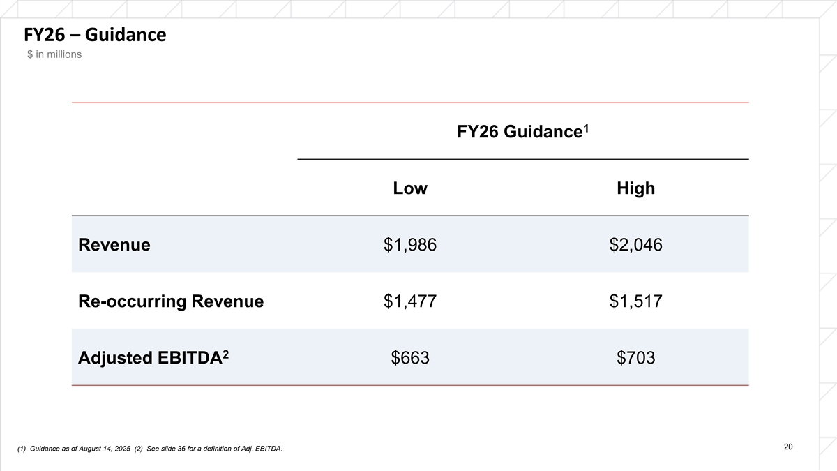 FY26 – Guidance $ in millions 1 FY26 Guidance Low High Revenue $1,986 $2,046 Re-occurring Revenue $1,477 $1,517 2 Adjusted EBITDA $663 $703 20 (1) Guidance as of August 14, 2025 (2) See slide 36 for a definition of Adj. EBITDA.