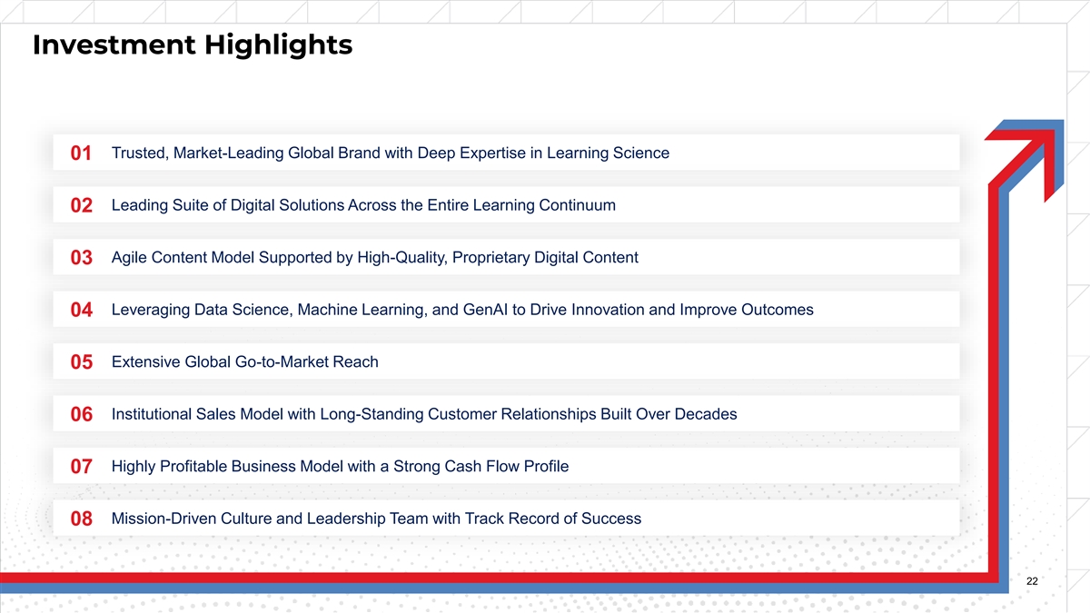 Investment Highlights Trusted, Market-Leading Global Brand with Deep Expertise in Learning Science 01 Leading Suite of Digital Solutions Across the Entire Learning Continuum 02 Agile Content Model Supported by High-Quality, Proprietary Digital Content 03 Leveraging Data Science, Machine Learning, and GenAI to Drive Innovation and Improve Outcomes 04 Extensive Global Go-to-Market Reach 05 Institutional Sales Model with Long-Standing Customer Relationships Built Over Decades 06 Highly Profitable Business Model with a Strong Cash Flow Profile 07 Mission-Driven Culture and Leadership Team with Track Record of Success 08 22