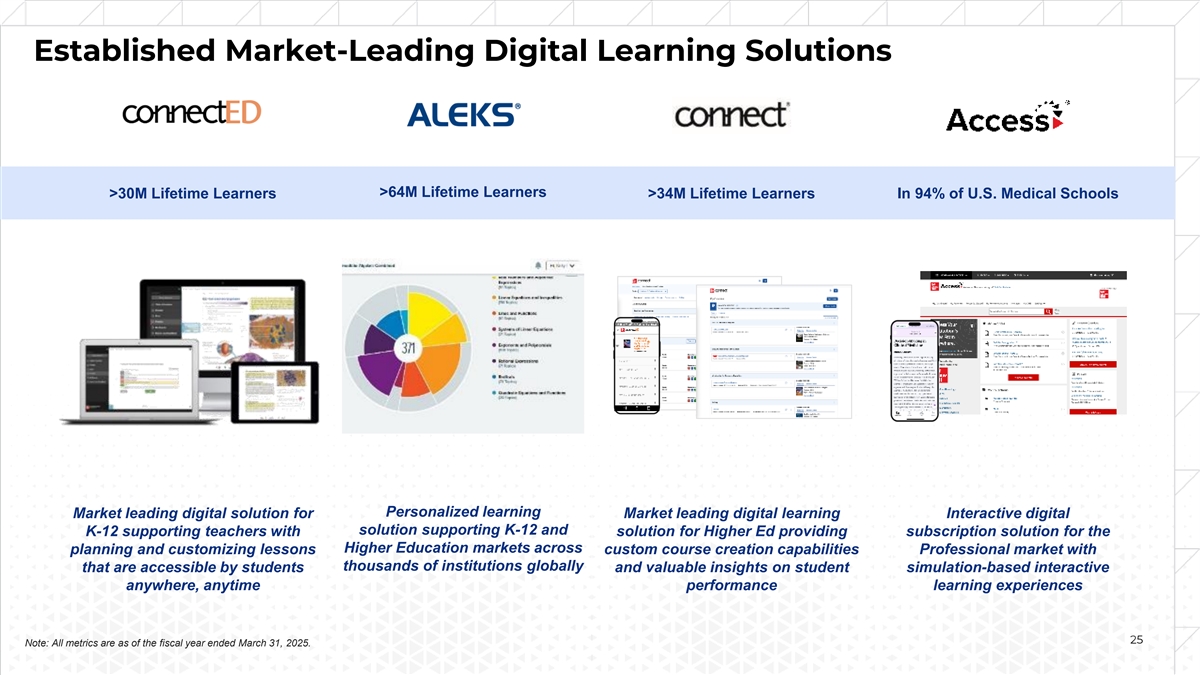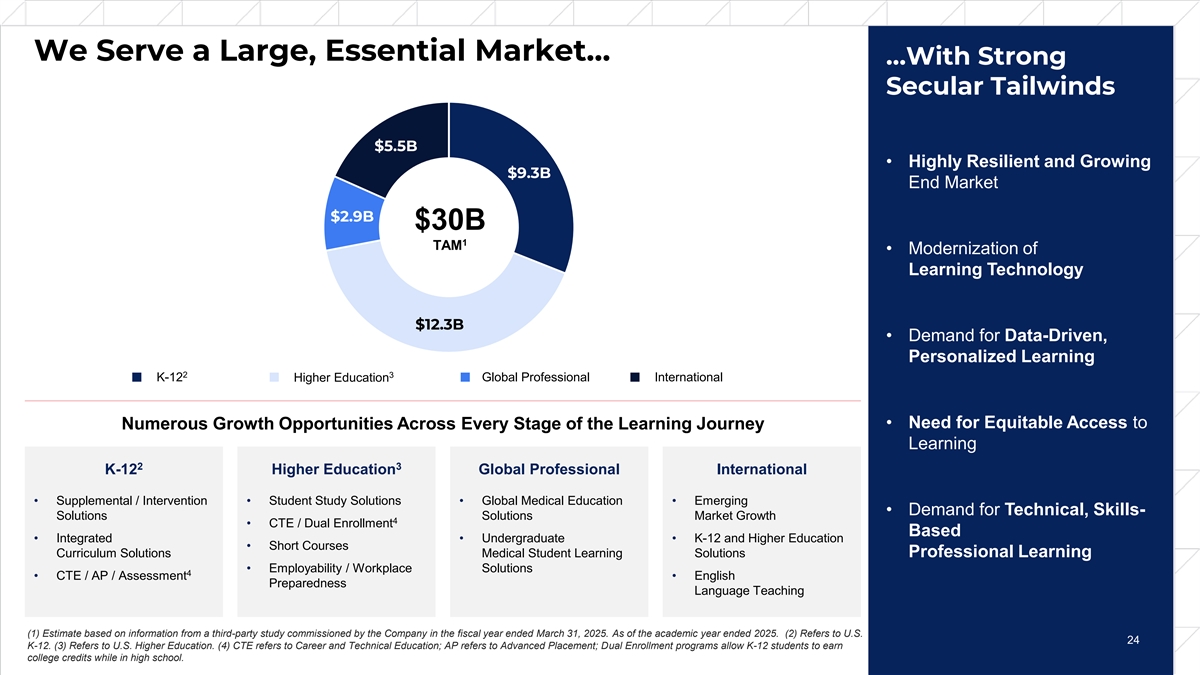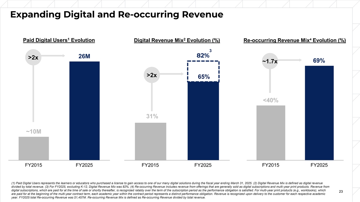 Expanding Digital and Re-occurring Revenue 1 2 Paid Digital Users Evolution Digital Revenue Mix Evolution (%) Re-occurring Revenue Mix⁴ Evolution (%) 3 >2x ~1.7x >2x 65% 31% (1) Paid Digital Users represents the learners or educators who purchased a license to gain access to one of our many digital solutions during the fiscal year ending March 31, 2025. (2) Digital Revenue Mix is defined as digital revenue divided by total revenue. (3) For FY2025, excluding K-12, Digital Revenue Mix was 82%. (4) Re-occurring Revenue includes revenue from offerings that are generally sold as digital subscriptions and multi-year print products. Revenue from digital subscriptions, which are paid for at the time of sale or shortly thereafter, is recognized ratably over the term of the subscription period as the performance obligation is satisfied. For multi-year print products (e.g., workbooks), which 23 are paid for at the beginning of the multi-year contract term, each academic year within the contract period represents a distinct performance obligation. Revenue is recognized upon delivery to the customer for each respective academic year. FY2025 total Re-occurring Revenue was $1,457M. Re-occurring Revenue Mix is defined as Re-occurring Revenue divided by total revenue.