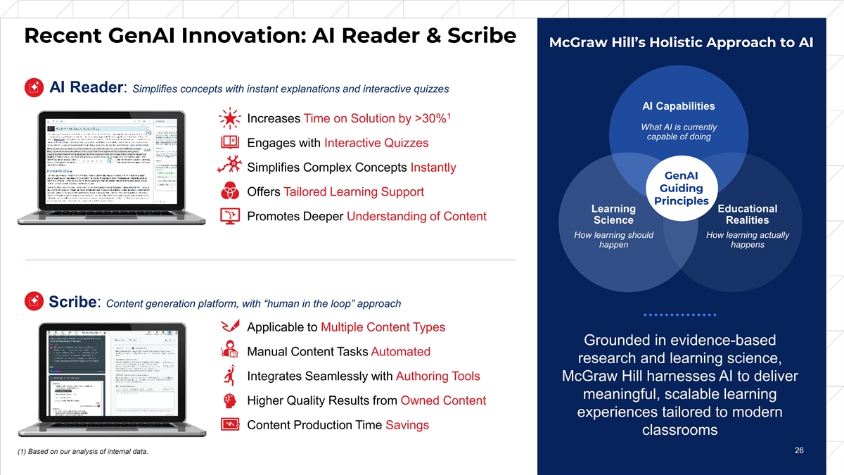 Recent GenAI Innovation: AI Reader & Scribe McGraw Hill’s Holistic Approach to AI AI Reader: Simplifies concepts with instant explanations and interactive quizzes AI Capabilities 1 Increases Time on Solution by >30% What AI is currently capable of doing Engages with Interactive Quizzes Simplifies Complex Concepts Instantly GenAI Guiding Offers Tailored Learning Support Principles Learning Educational Promotes Deeper Understanding of Content Science Realities How learning should How learning actually happen happens Scribe: Content generation platform, with “human in the loop” approach Applicable to Multiple Content Types Grounded in evidence-based Manual Content Tasks Automated research and learning science, Integrates Seamlessly with Authoring Tools McGraw Hill harnesses AI to deliver meaningful, scalable learning Higher Quality Results from Owned Content experiences tailored to modern Content Production Time Savings classrooms 26 26 (1) Based on our analysis of internal data.